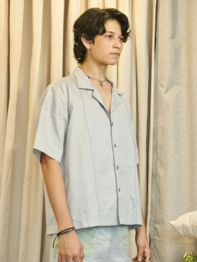 A Chinese-collared shirt with 3/4th sleeves and a concealed button-down front, featuring a tonal ombre patch composed of a three-hue gradient on one side. Regular Fit -