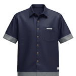 A zip-front shirt featuring a Chinese collar and short sleeves, detailed with a Grey open chest pocket and a signature canvas strip. Relaxed Fit -