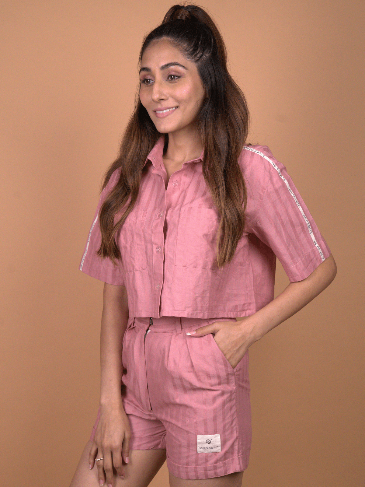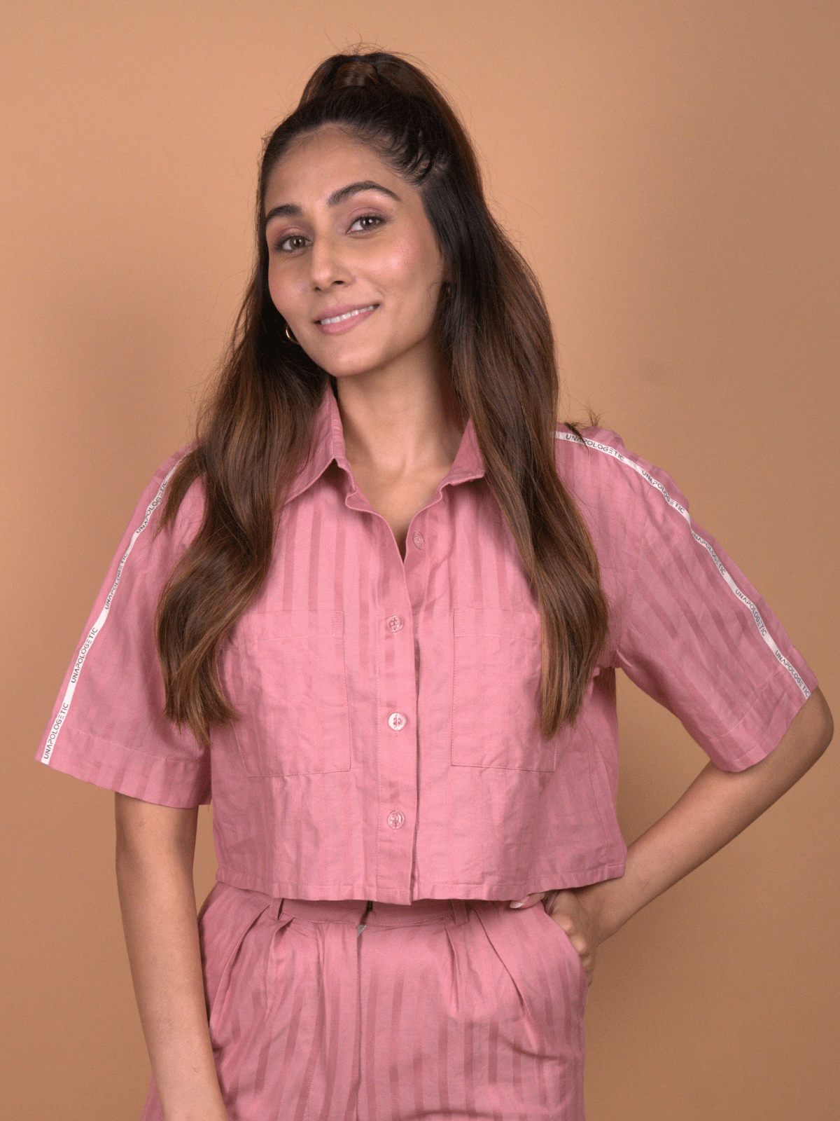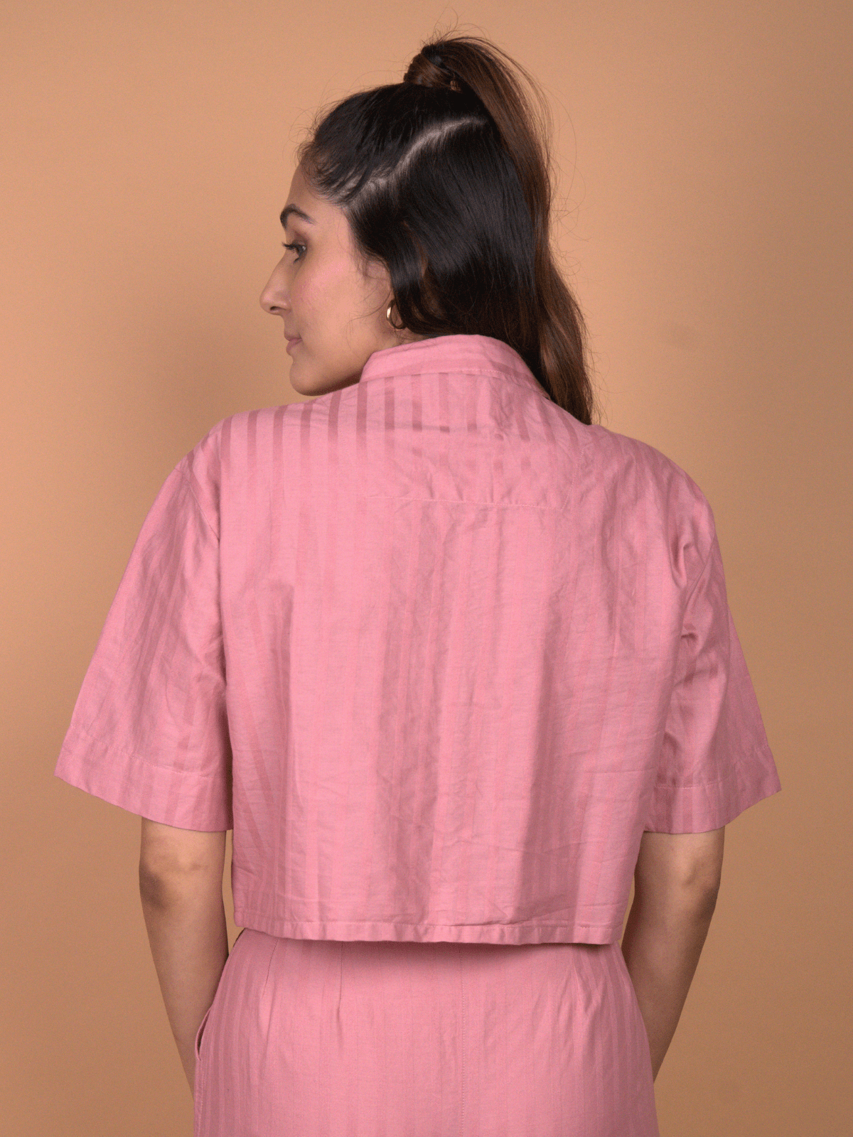 -The top is a box-cut, collared, button-down cropped shirt, balancing sharp tailoring with relaxed, easy wearability.