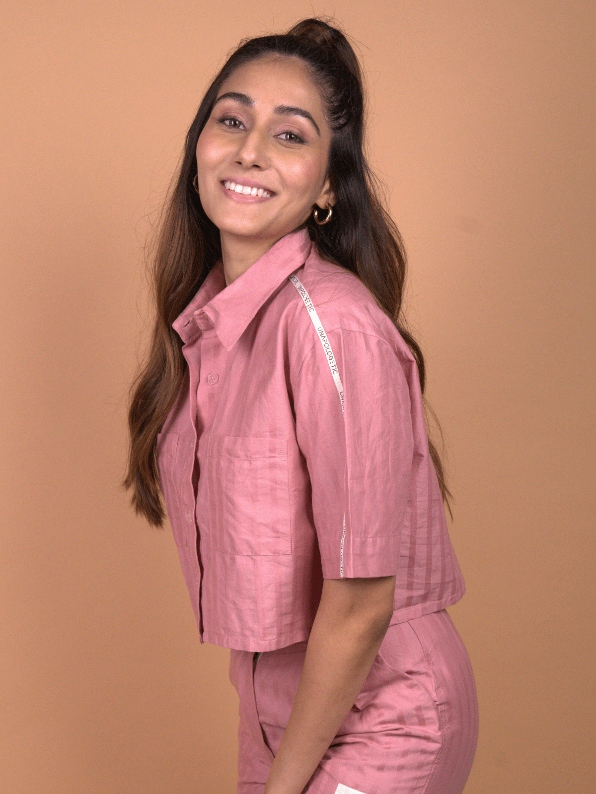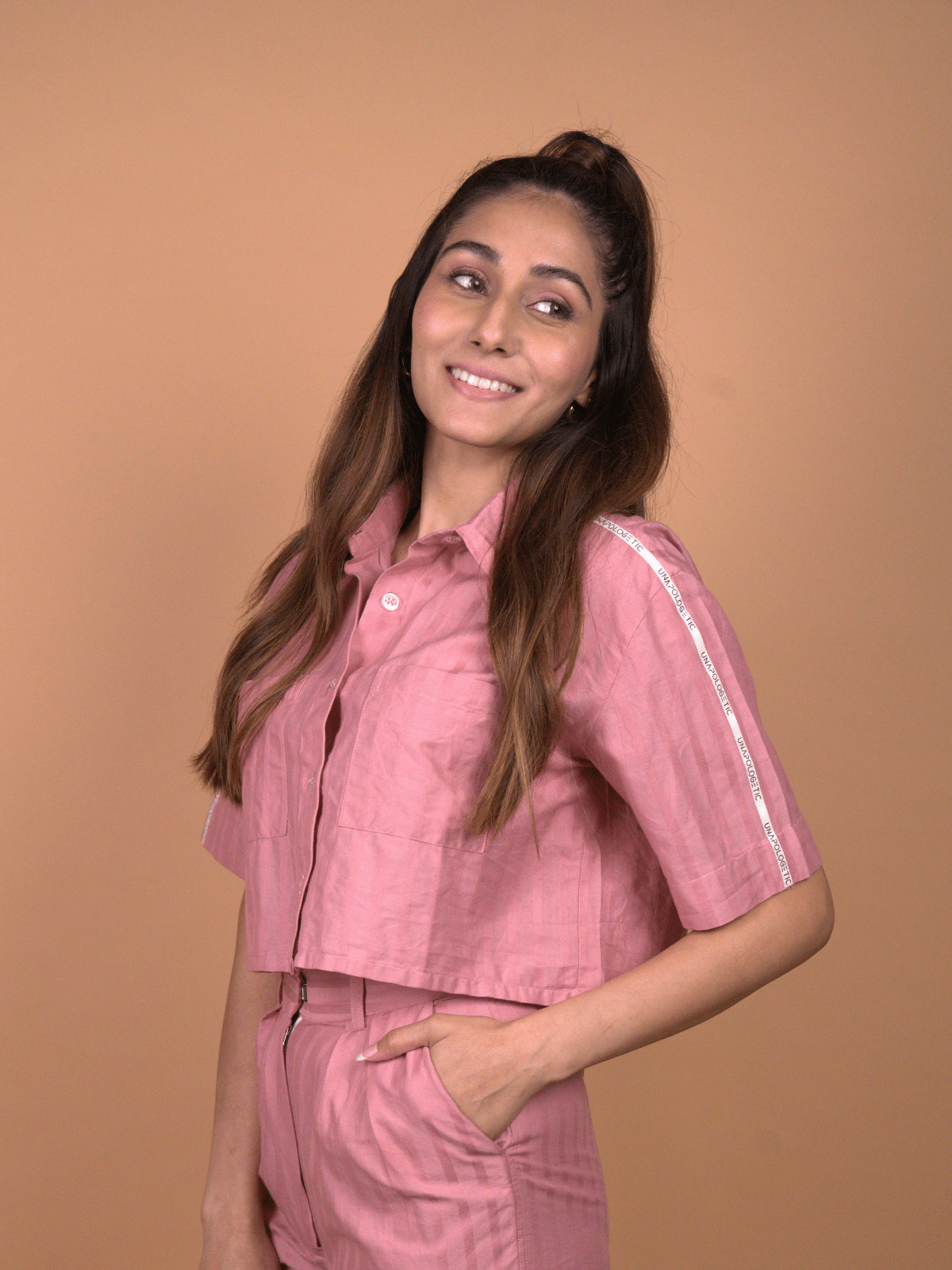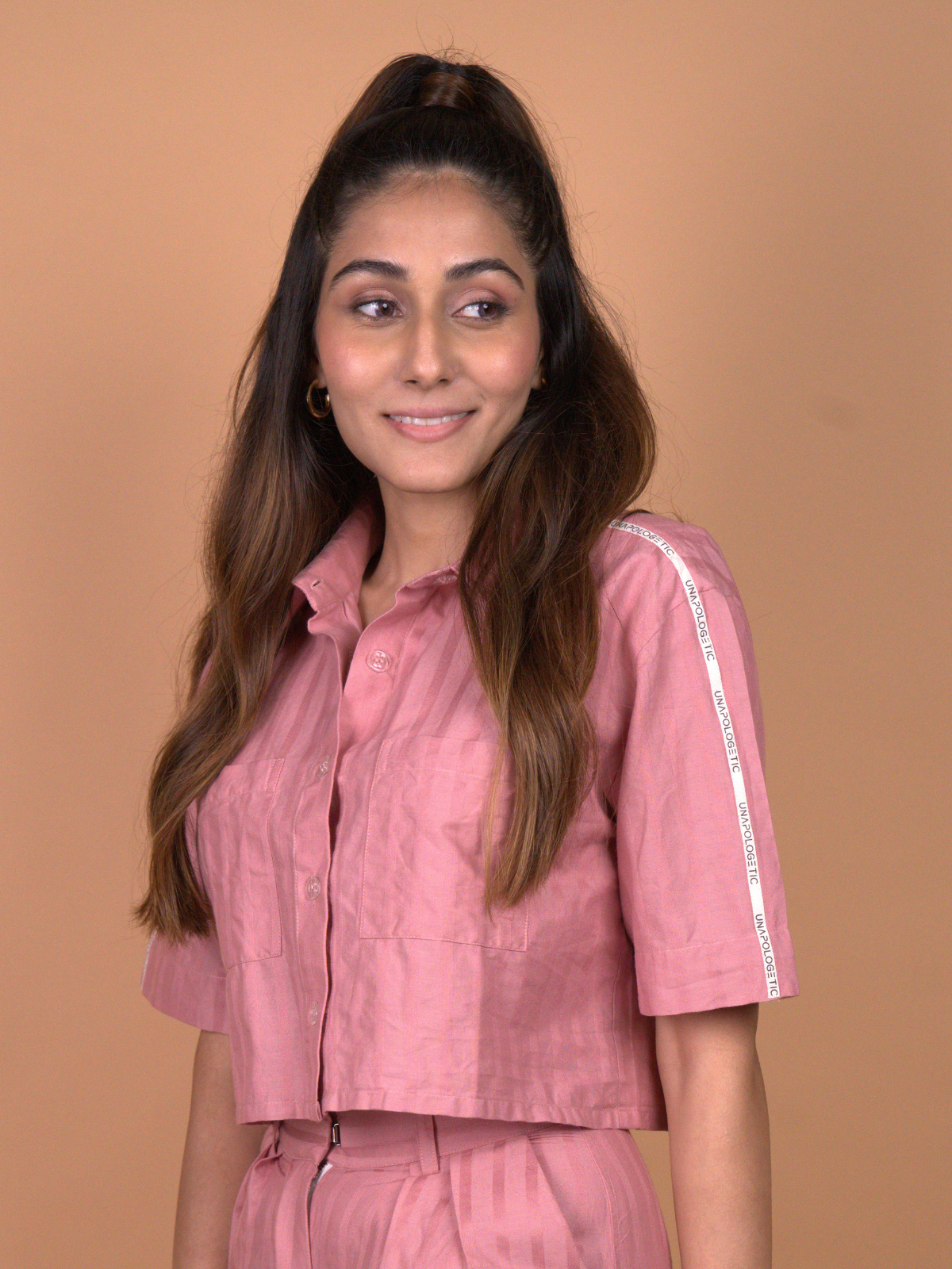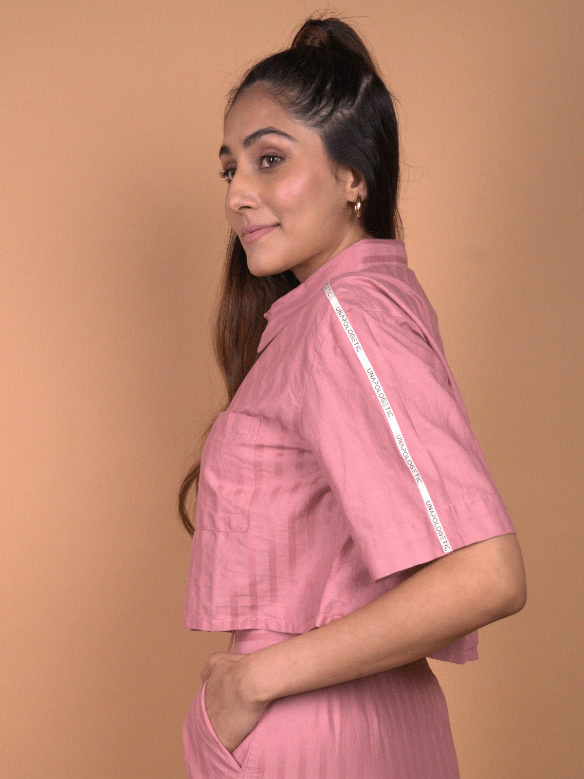 -The top is a box-cut, collared, button-down cropped shirt, balancing sharp tailoring with relaxed, easy wearability.