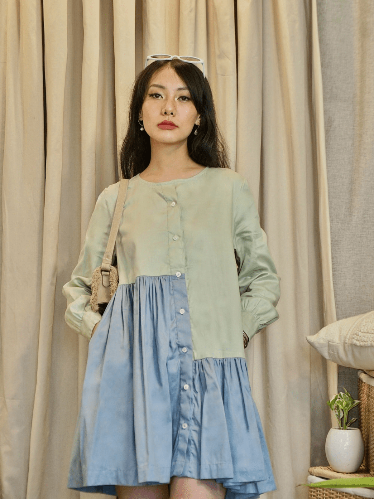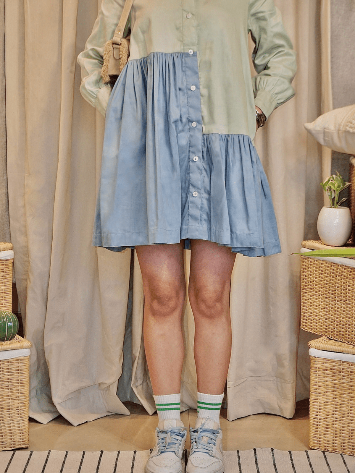 – Dual-tone button-down dress featuring an asymmetrical color pattern.