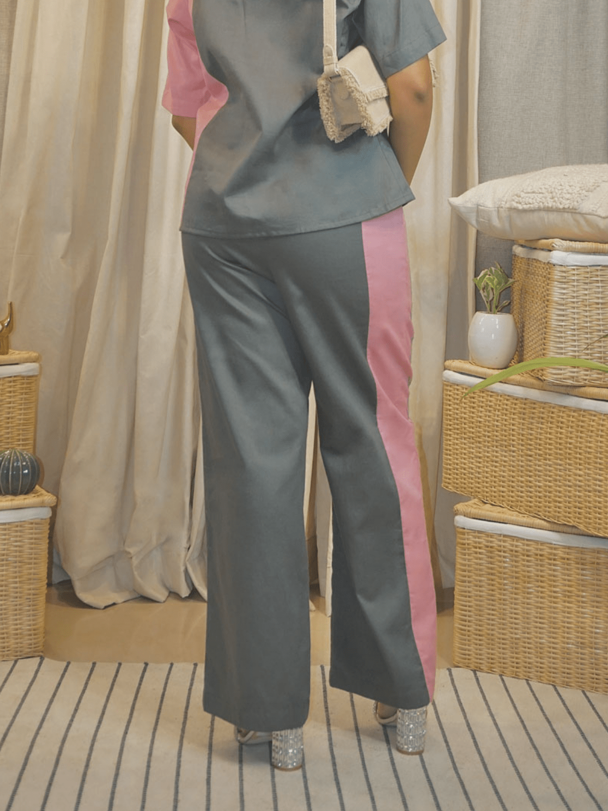– Continues the dual-colored theme with contrast arrow embroidery on the right leg.