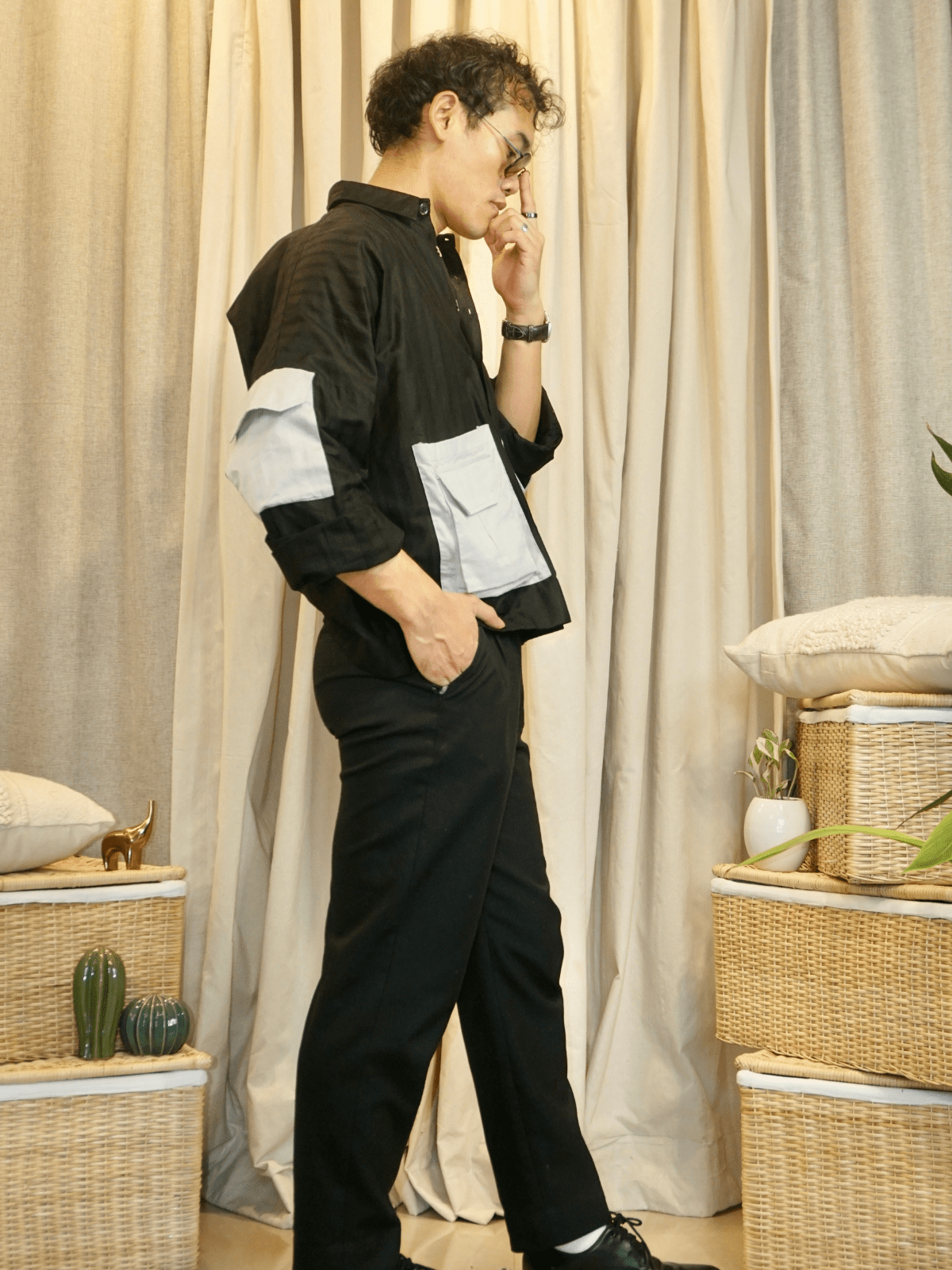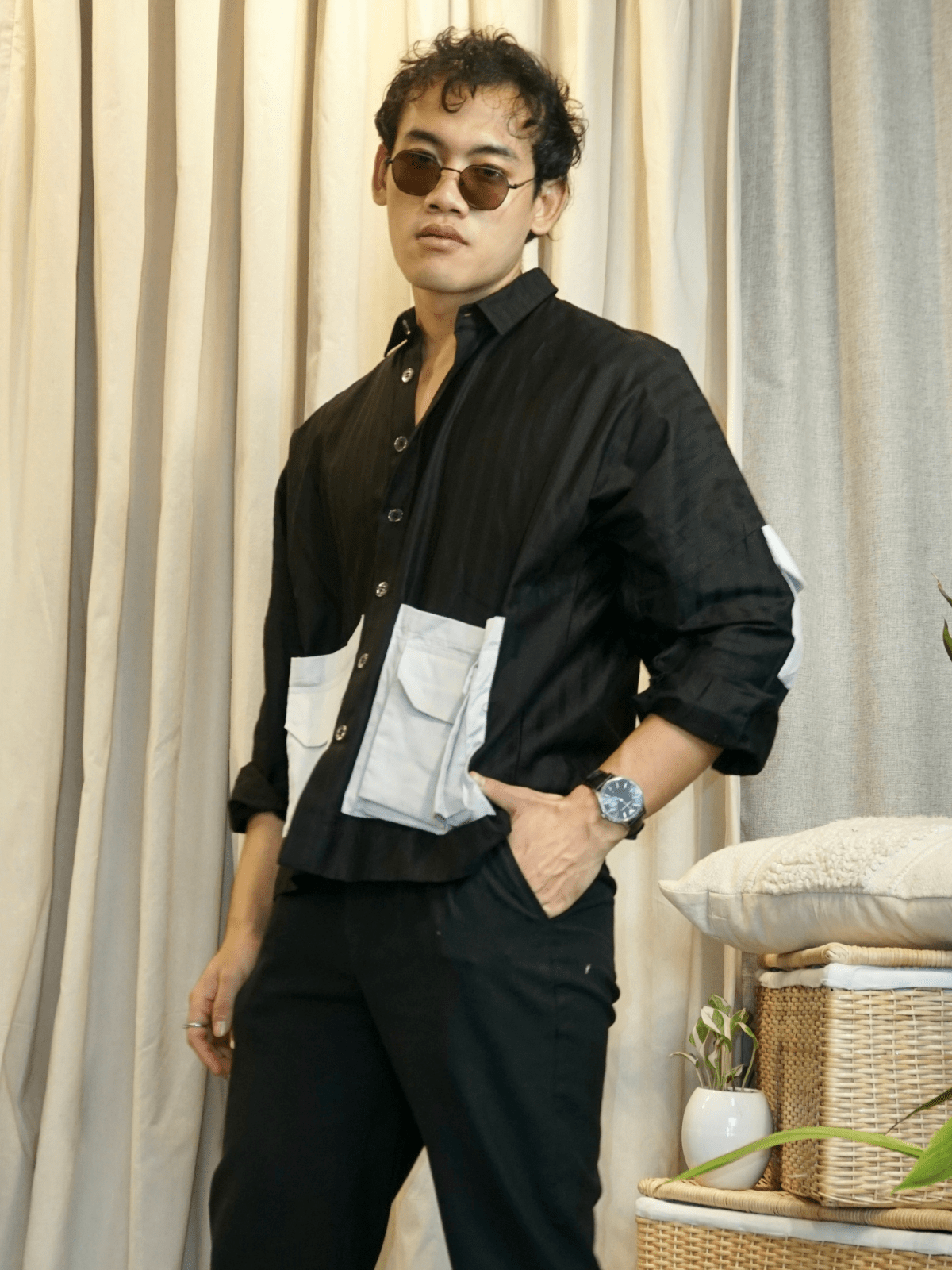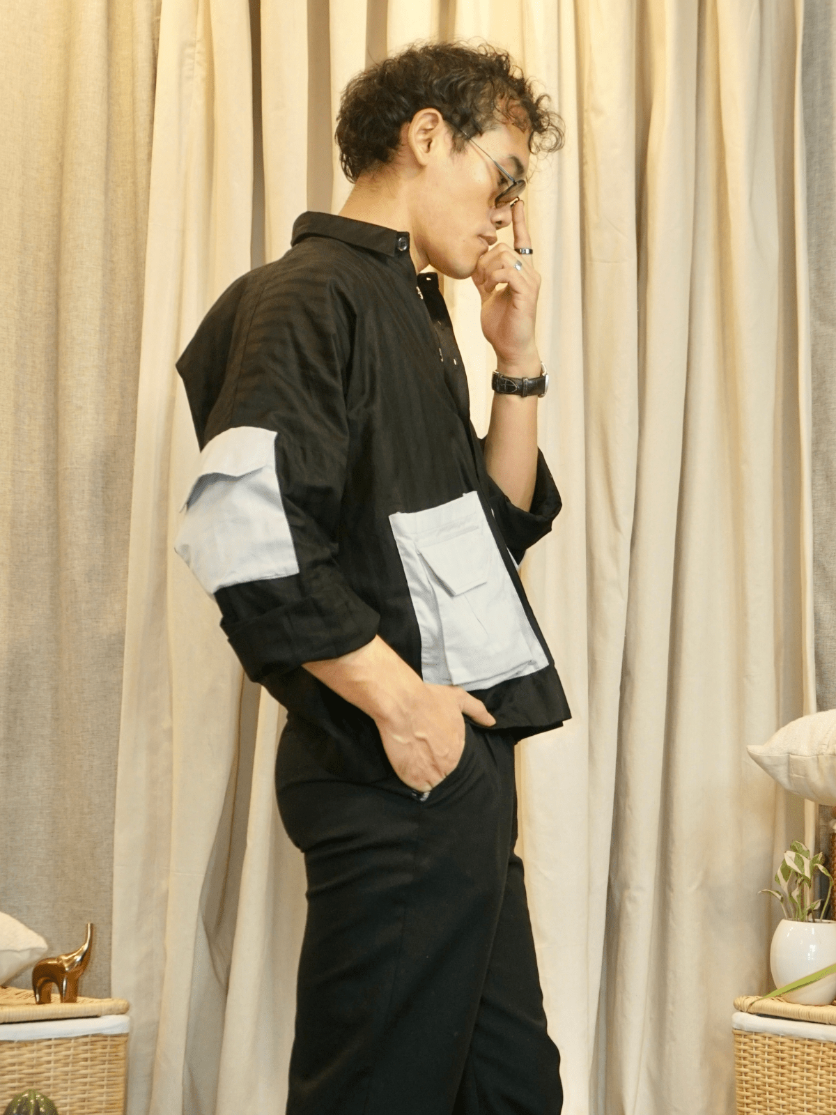 Pair it with: Slim chinos or denims, a leather or canvas backpack, and casual sneakers. Let the shirt fall loose or do a half tuck to highlight the layering pockets.
