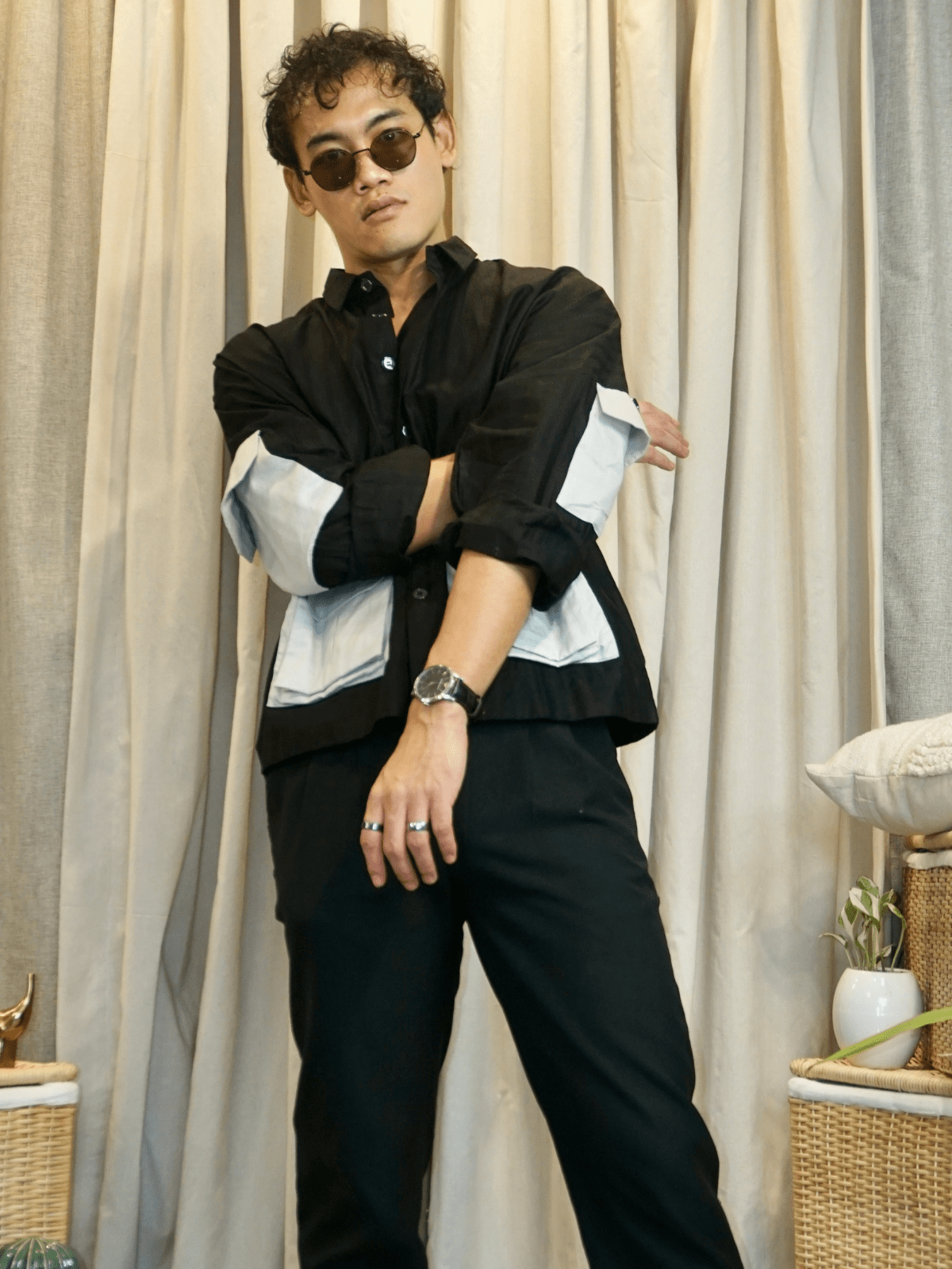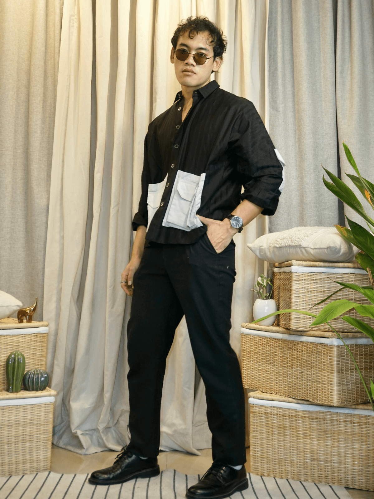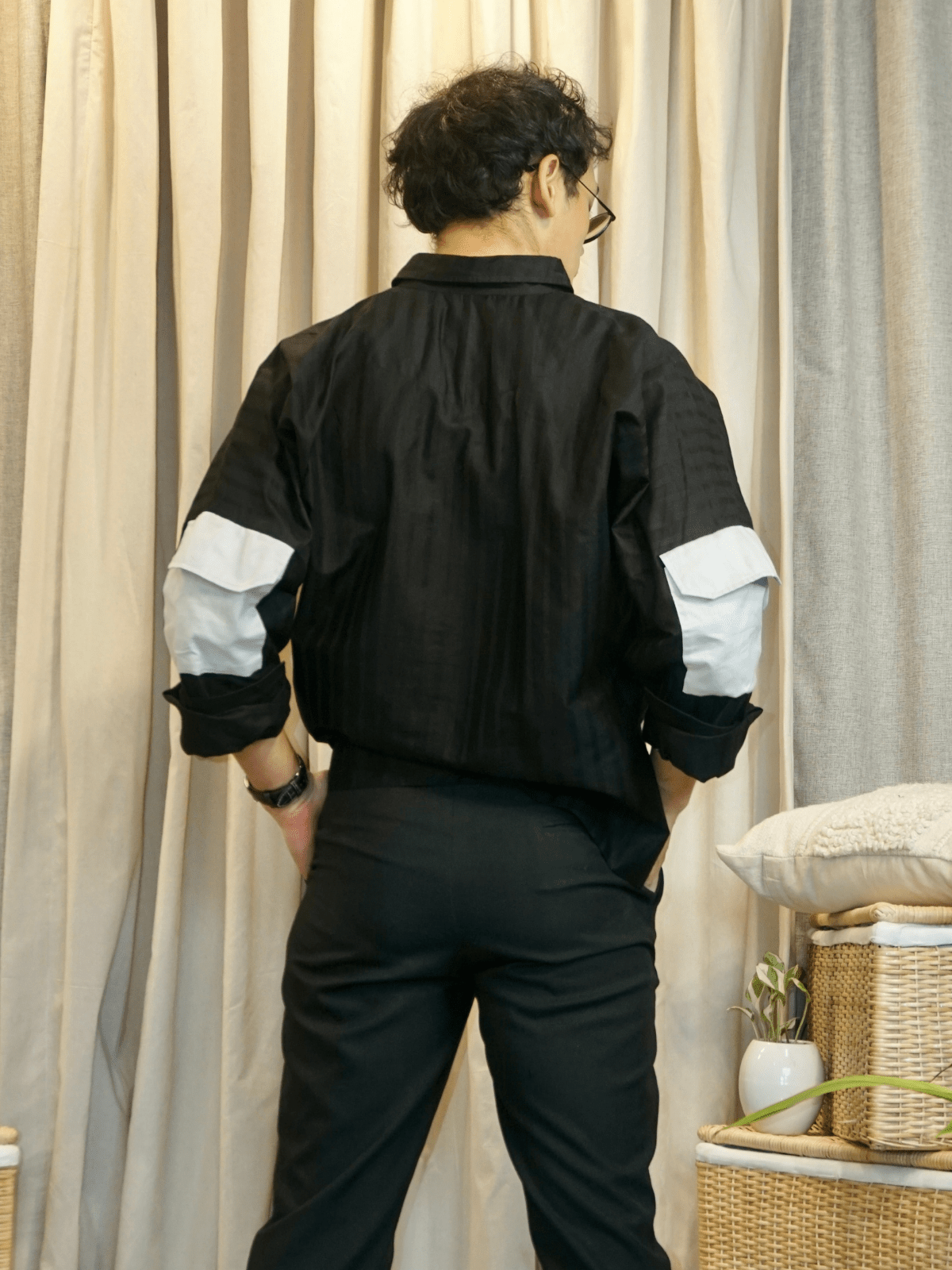 Pair it with: Slim chinos or denims, a leather or canvas backpack, and casual sneakers. Let the shirt fall loose or do a half tuck to highlight the layering pockets.
