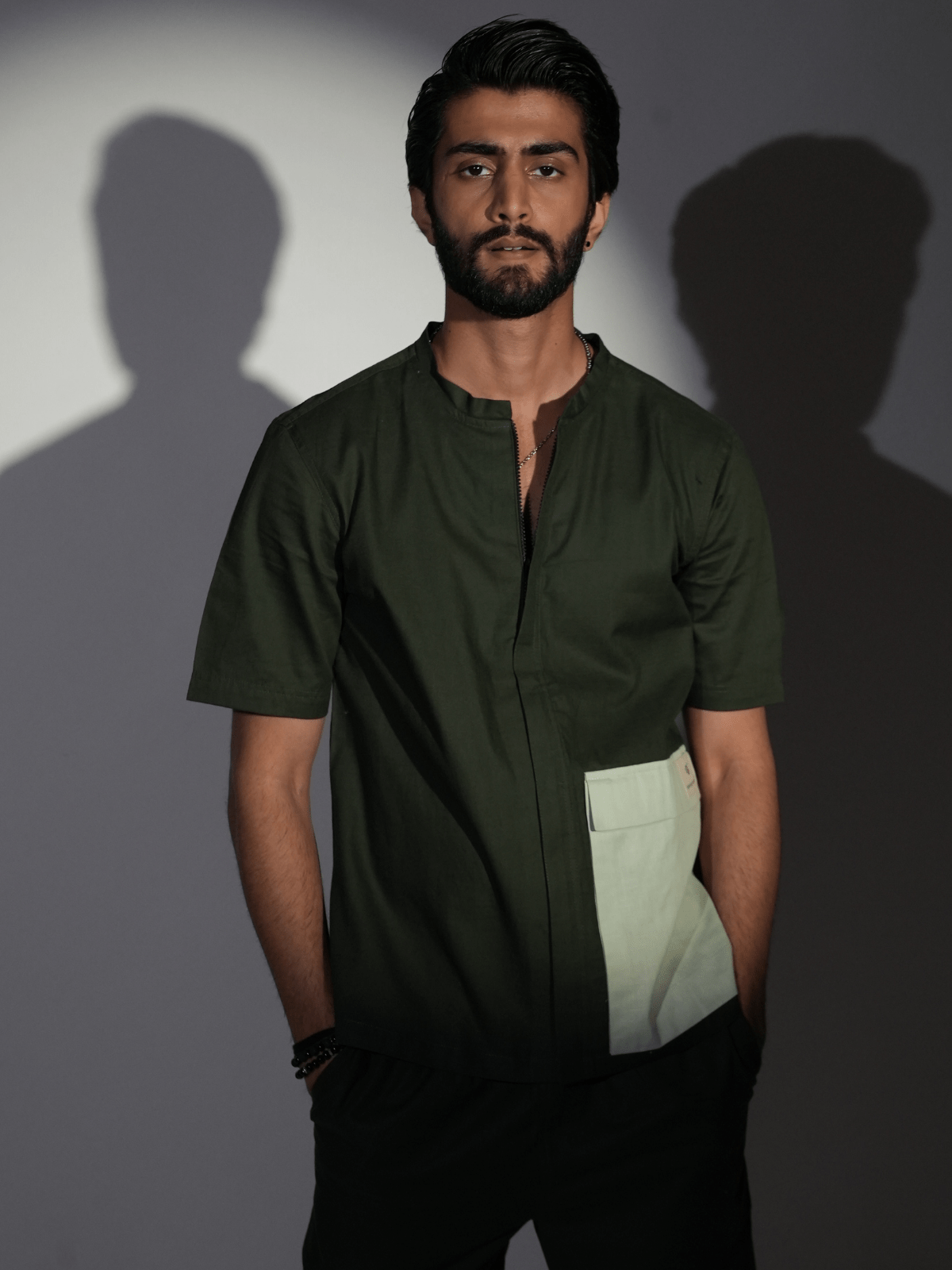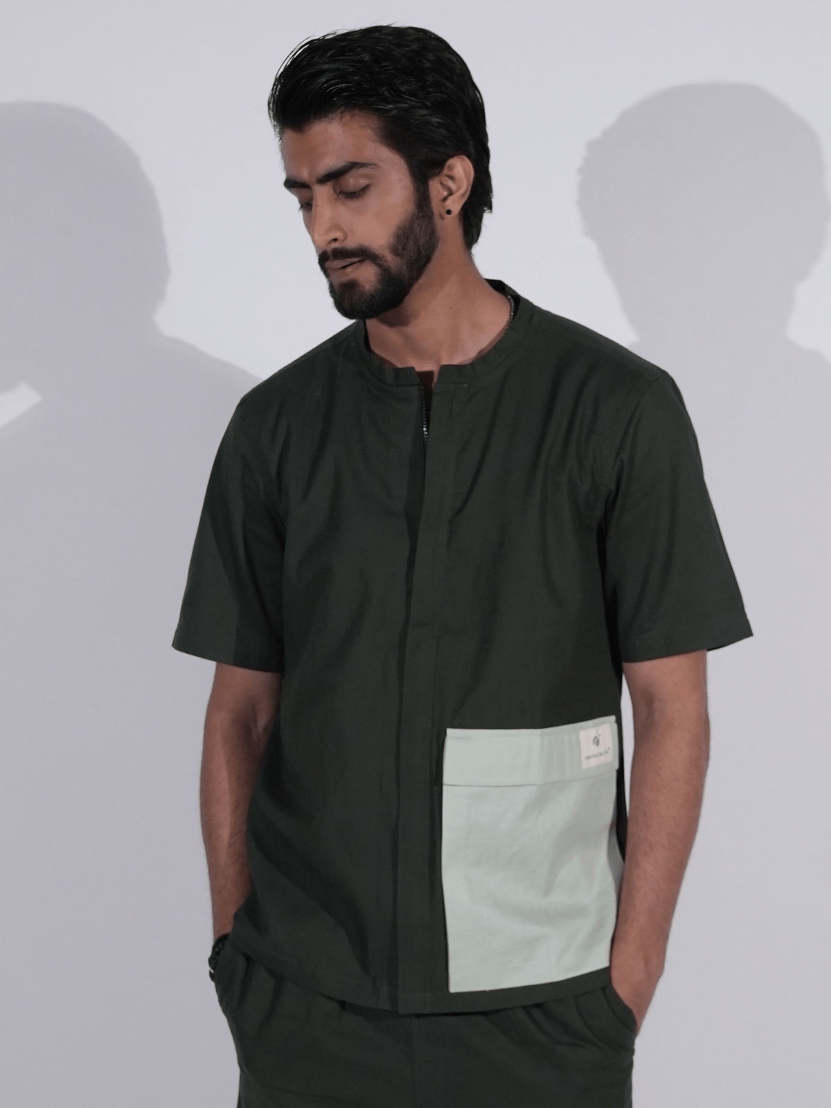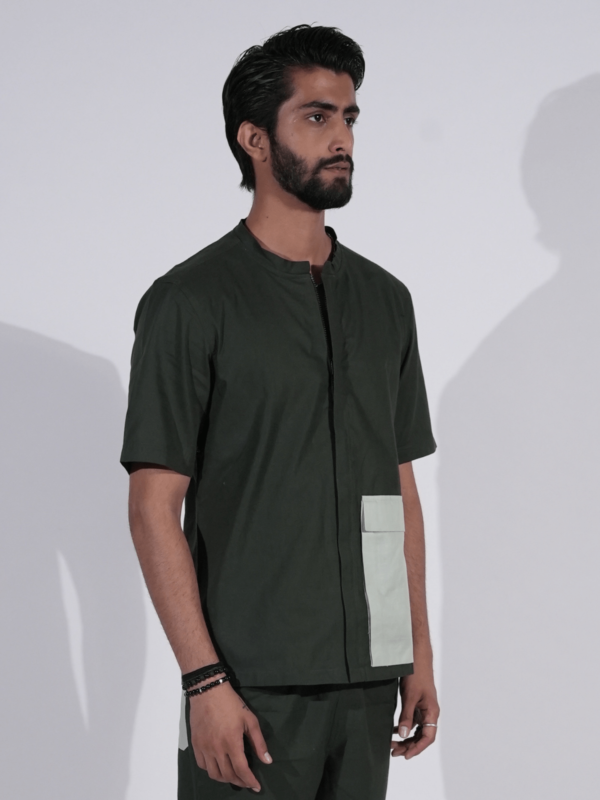 – The shirt features a clean, zipped design with a sharp Chinese collar, offering a minimalist yet striking silhouette.