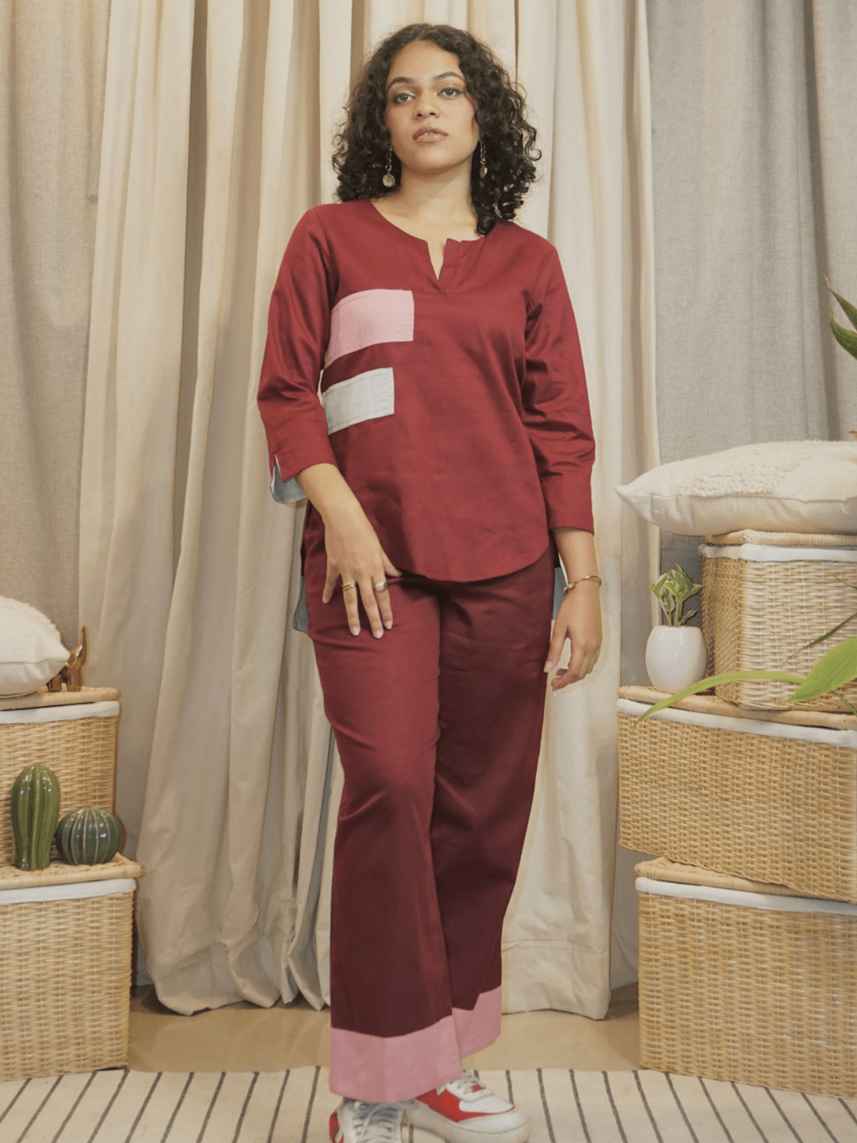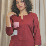 A round-neck top with 3/4th sleeves, featuring tonal rectangular patches on the right side finished with contrast anchor stitching for a textured, hand-crafted detail. Relaxed Fit