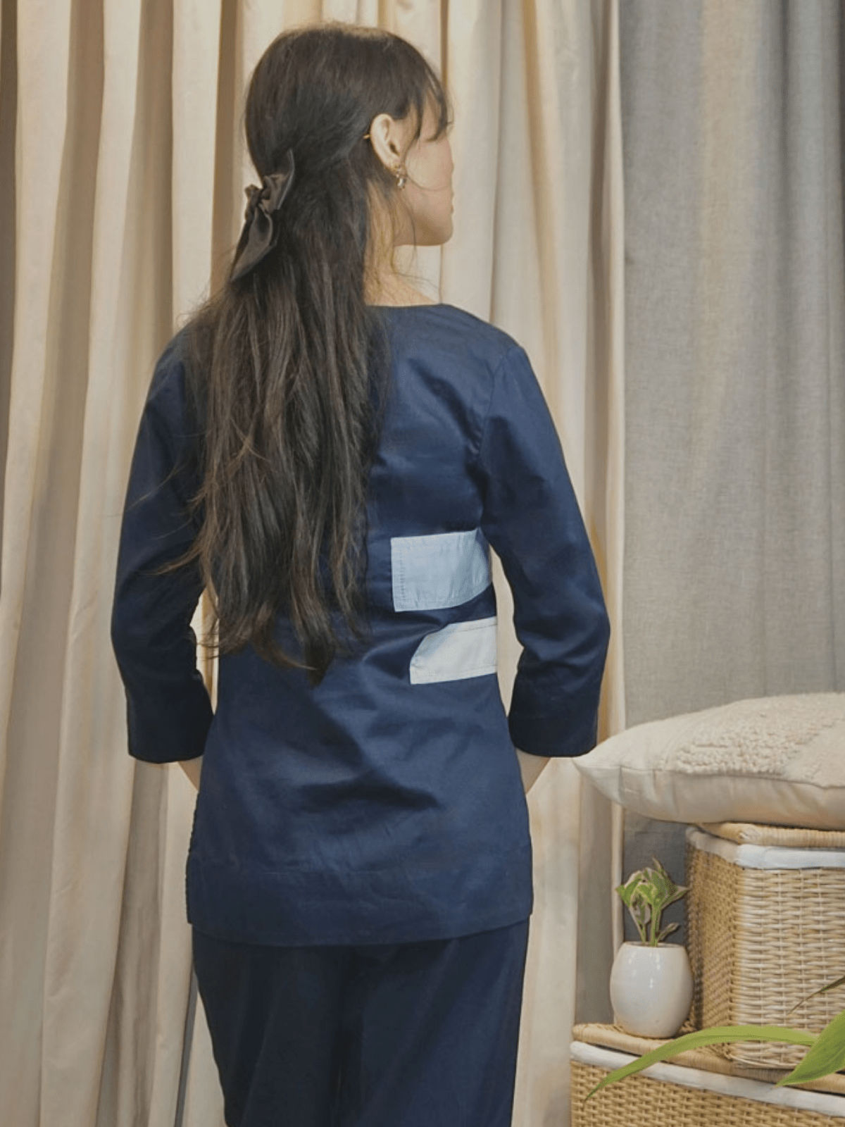 A round-neck top with 3/4th sleeves, featuring tonal rectangular patches on the right side finished with contrast anchor stitching for a textured, hand-crafted detail. Relaxed Fit