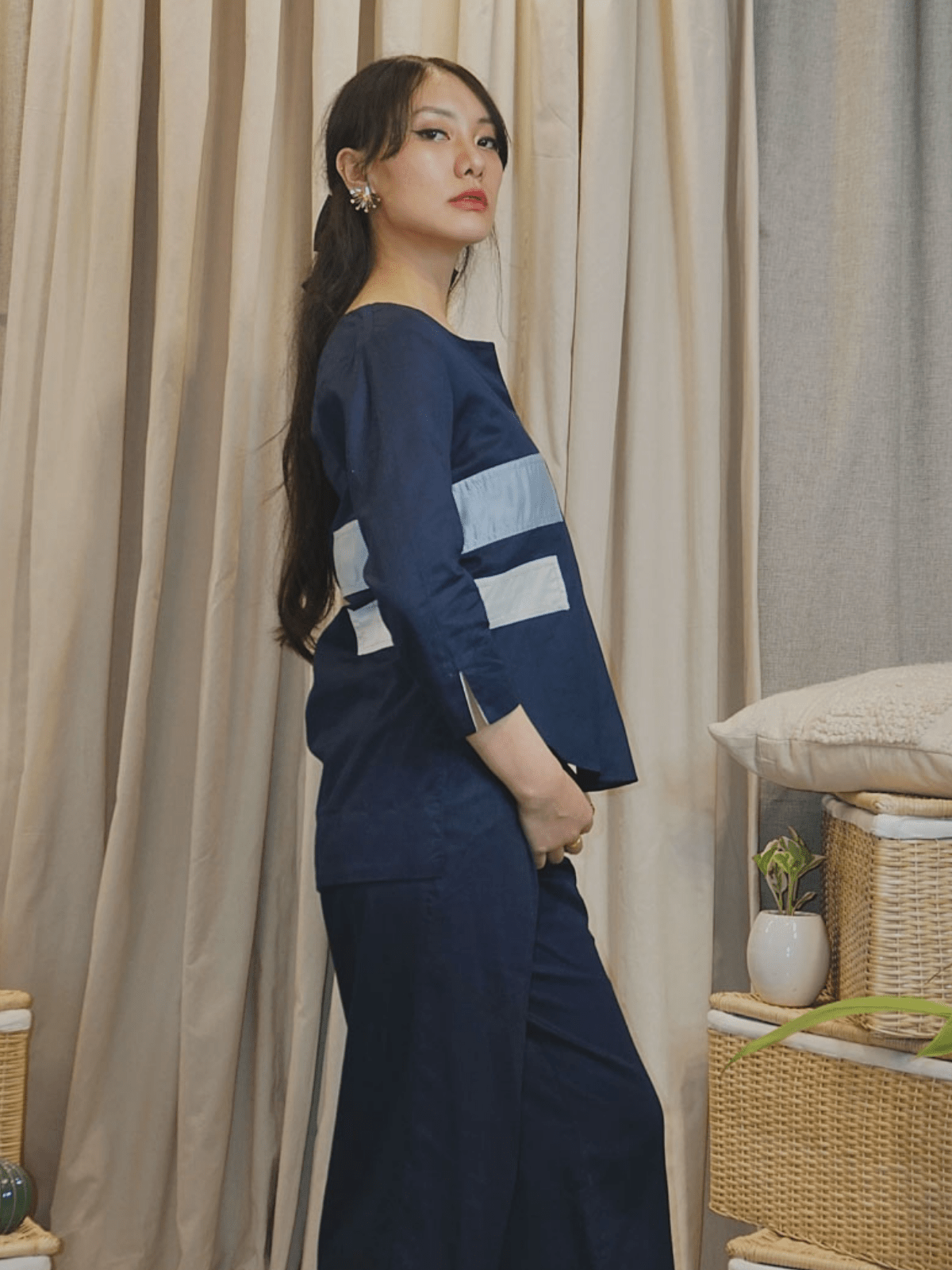 Pair it with: matching navy trousers, statement heels, bold eye makeup, and a slicked ponytail. A clutch and subtle shimmer finish the look.