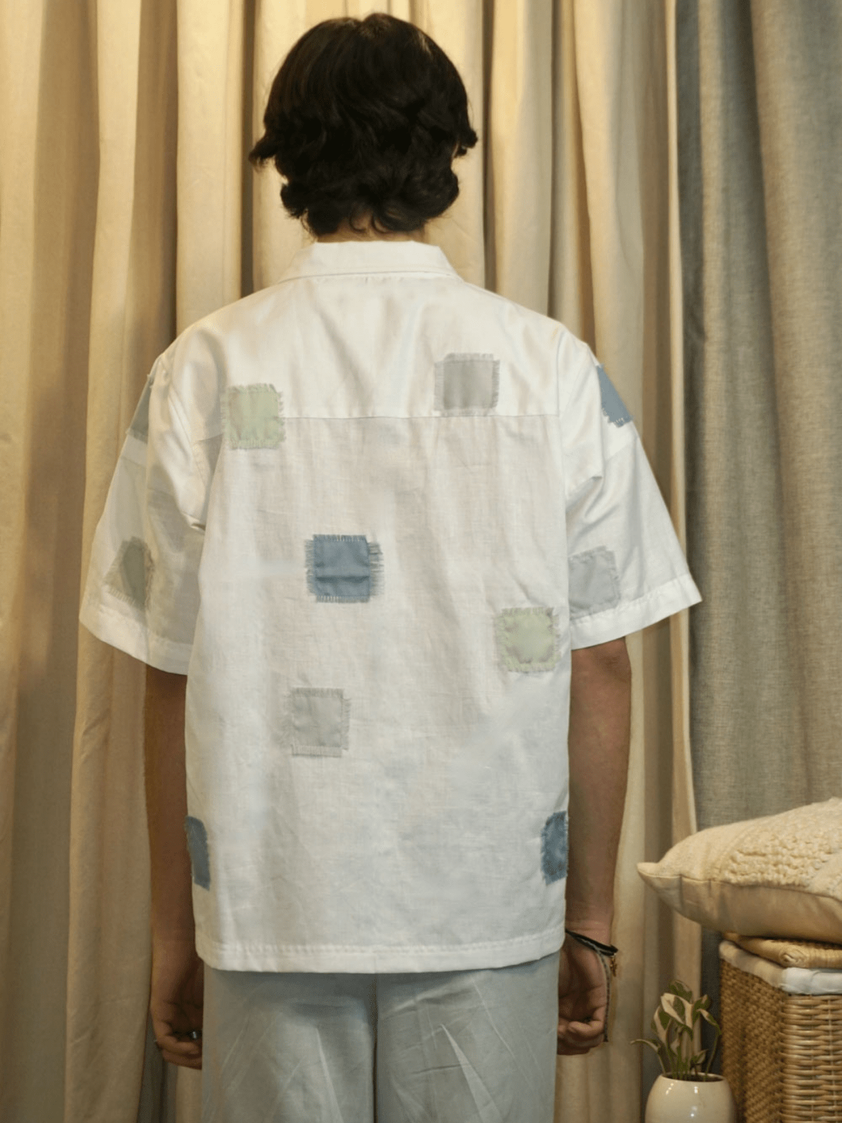 – Patches are stitched unevenly across the front, back, and sleeves.