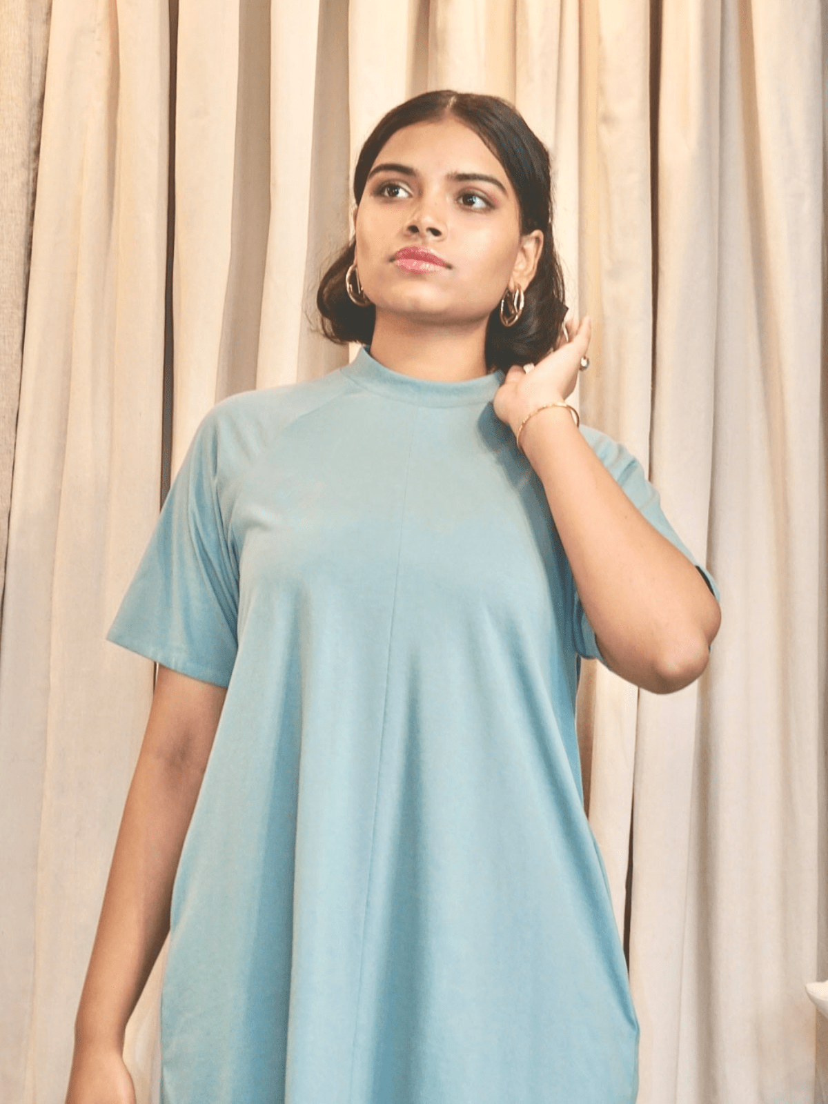 A Jersey knit tshirt dress featuring Raglan sleeves and pockets. Relaxed Fit