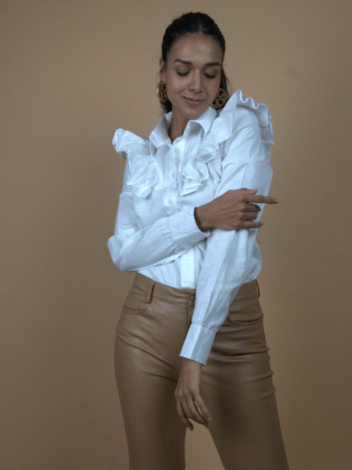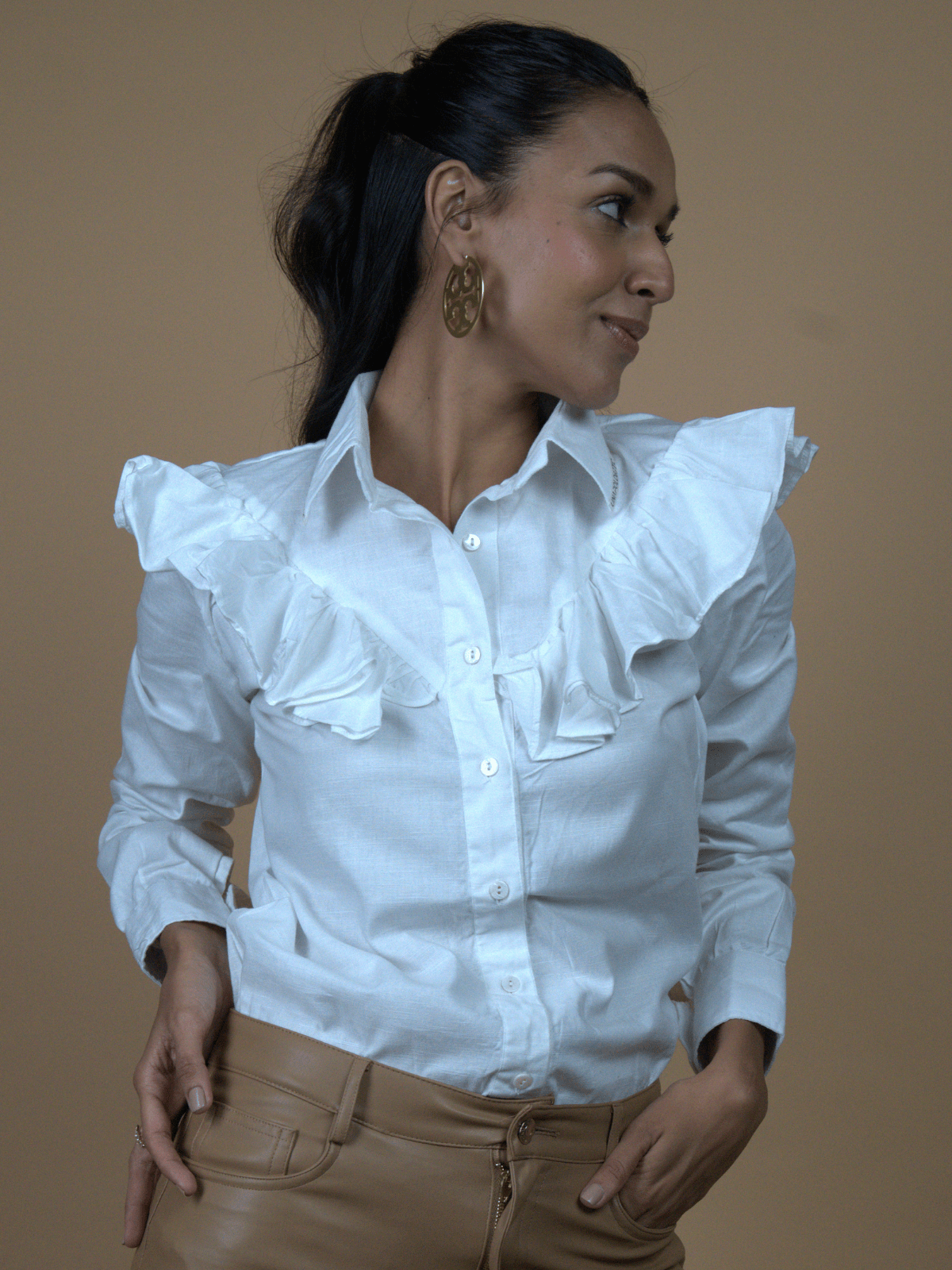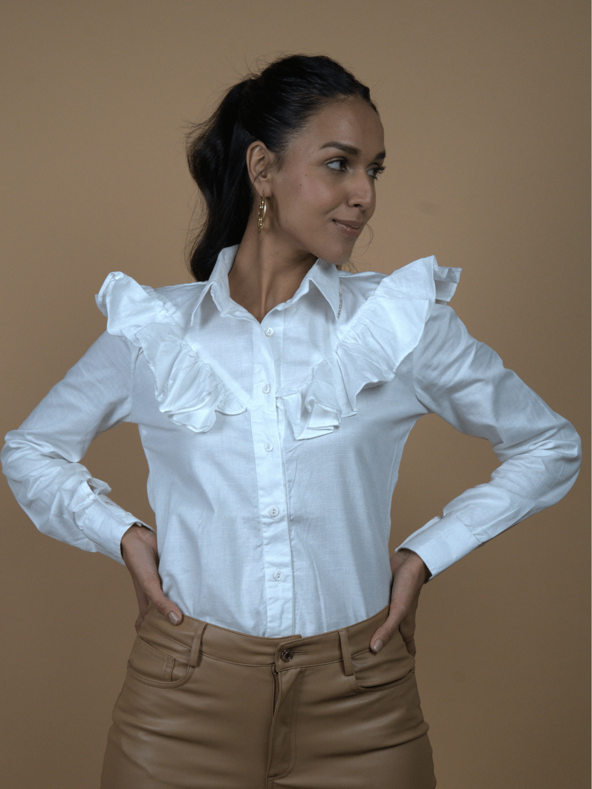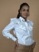 – A crisp white collared shirt that blurs the line between effortless ease and intentional flair.