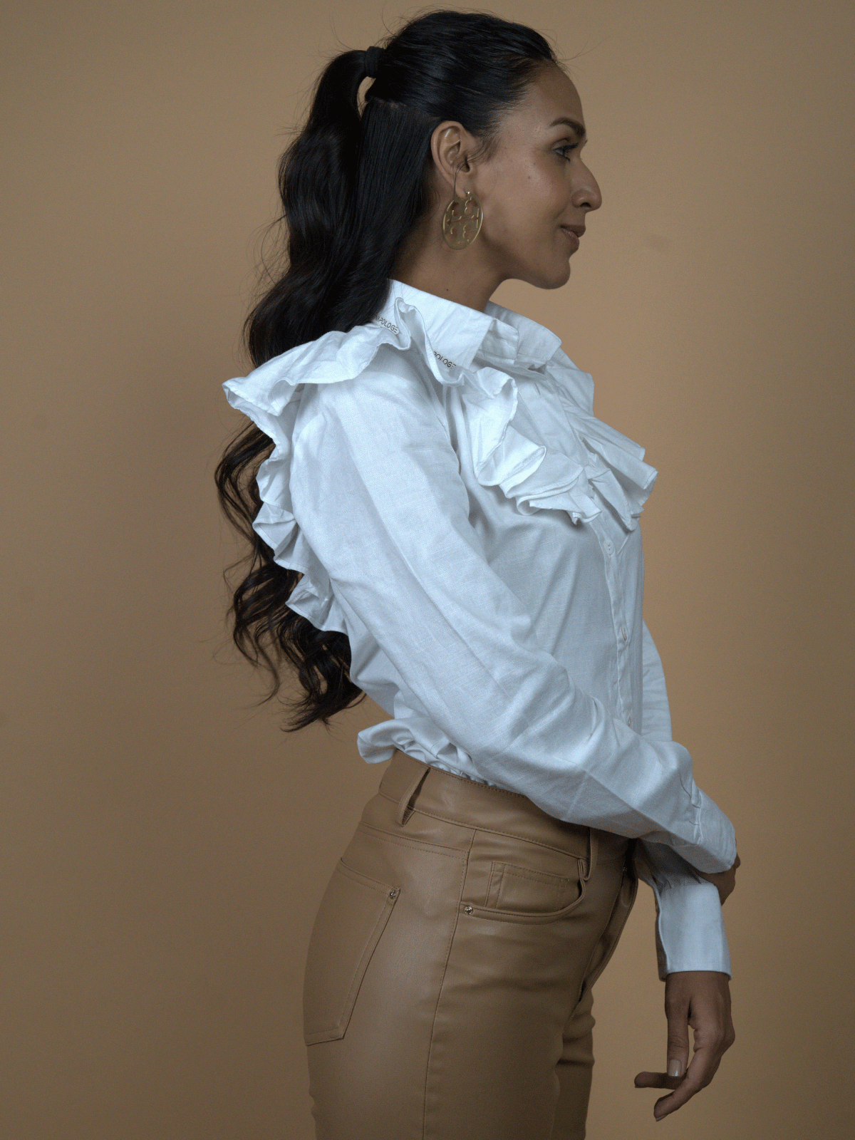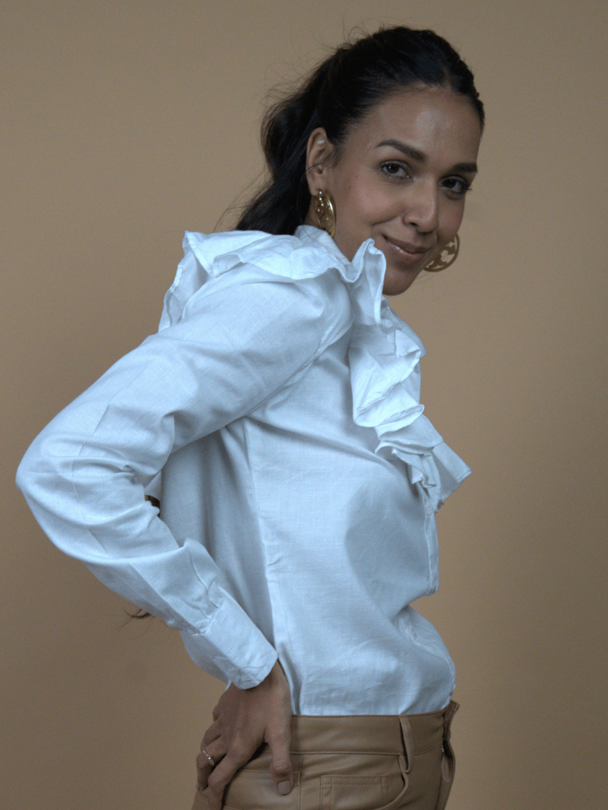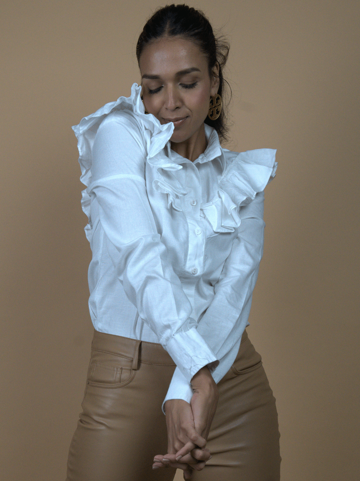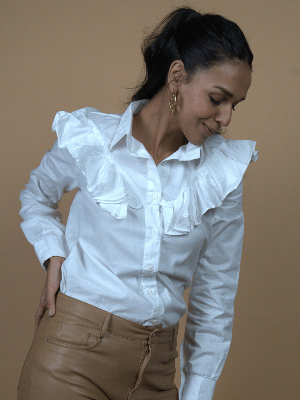 – A crisp white collared shirt that blurs the line between effortless ease and intentional flair.