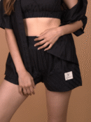– The high-waist pull-up shorts feature an elasticated back for ease and comfort.