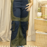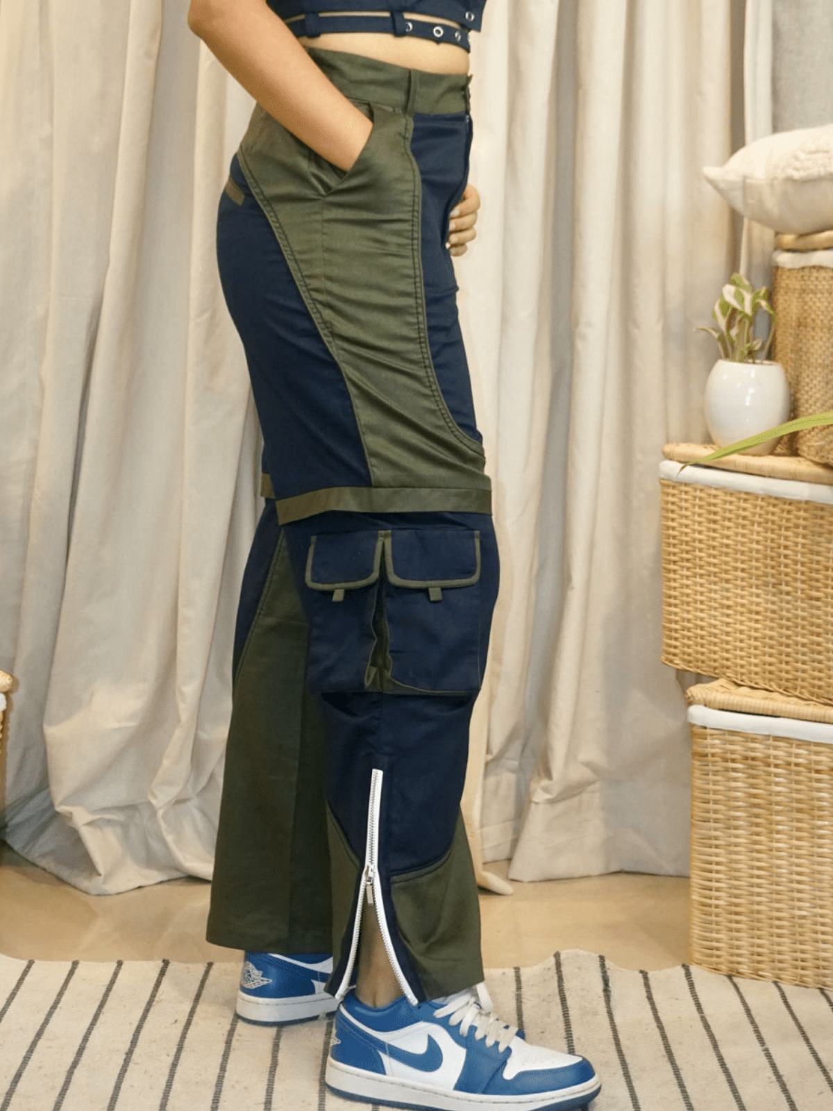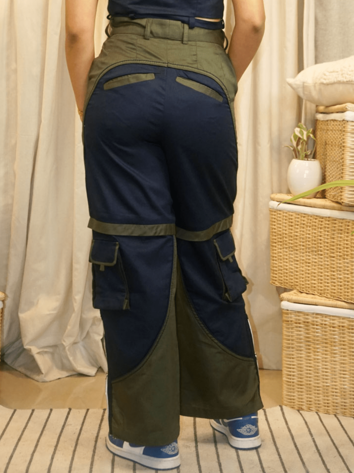 – Dual-colour cargo pants designed with symmetrical patchwork to create a shorts illusion.