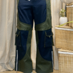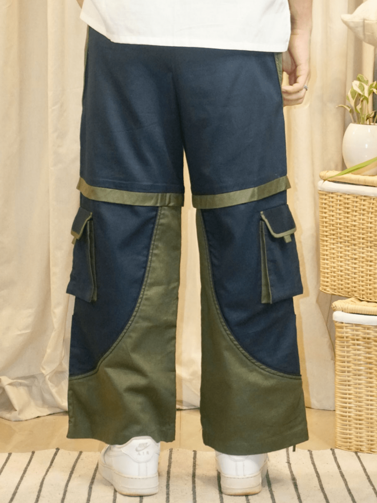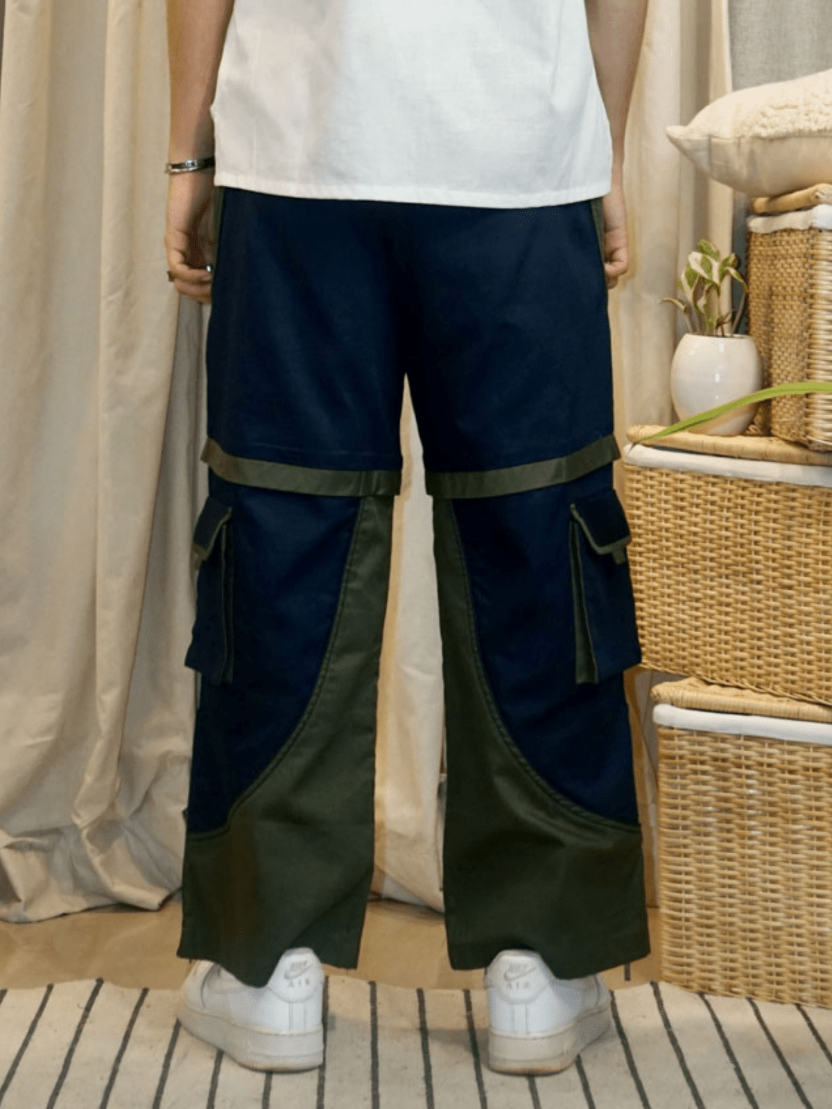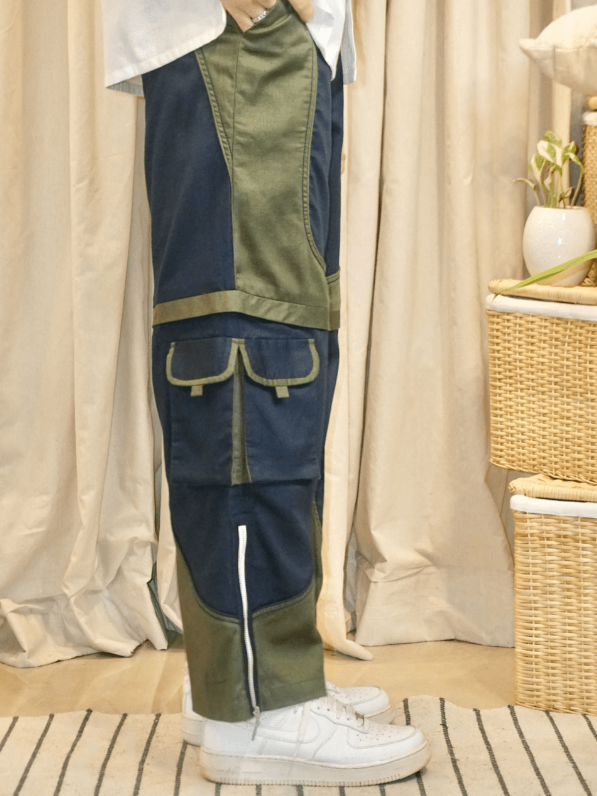 – Dual-colour cargo pants designed with symmetrical patchwork to create a shorts illusion.