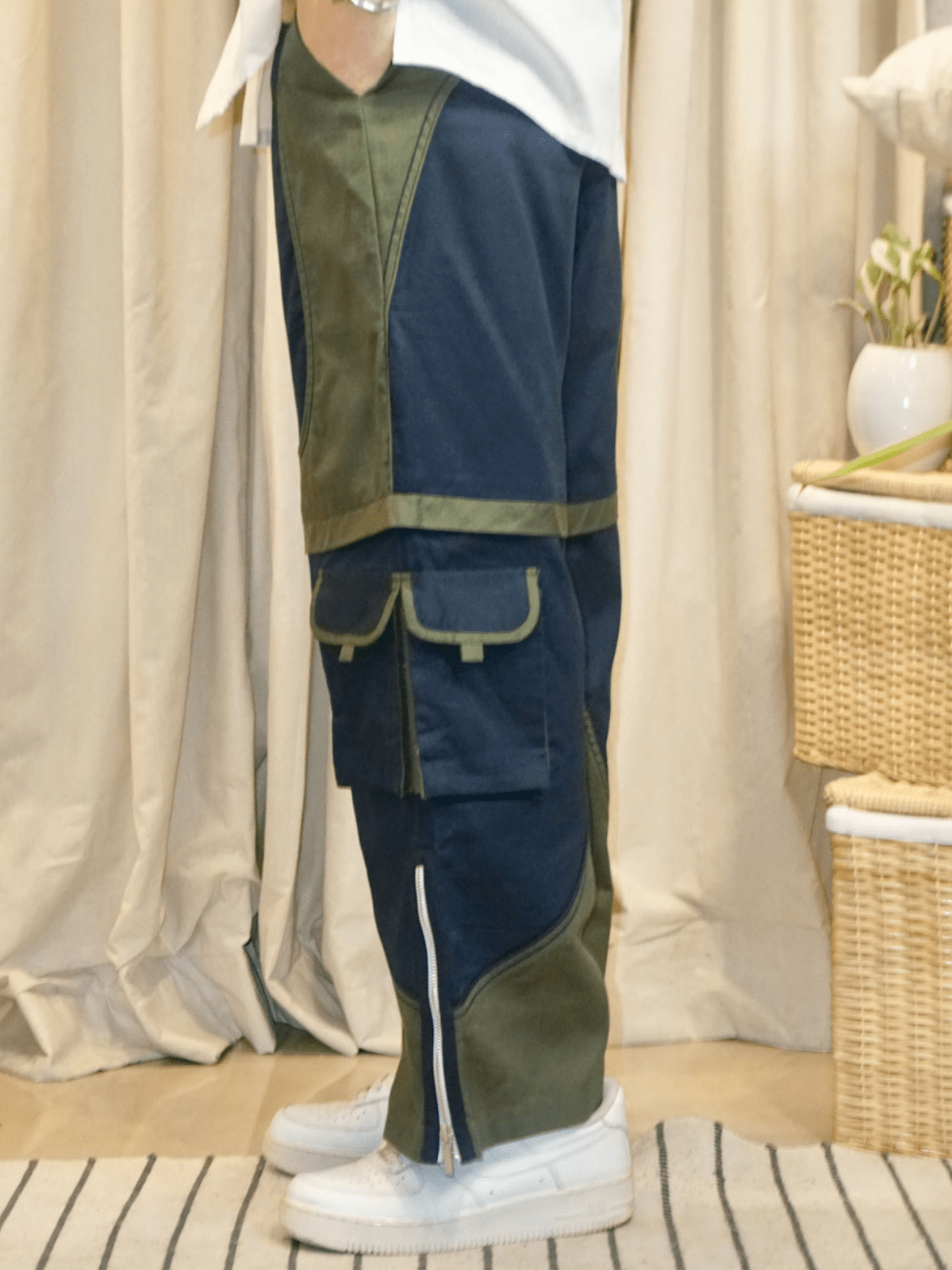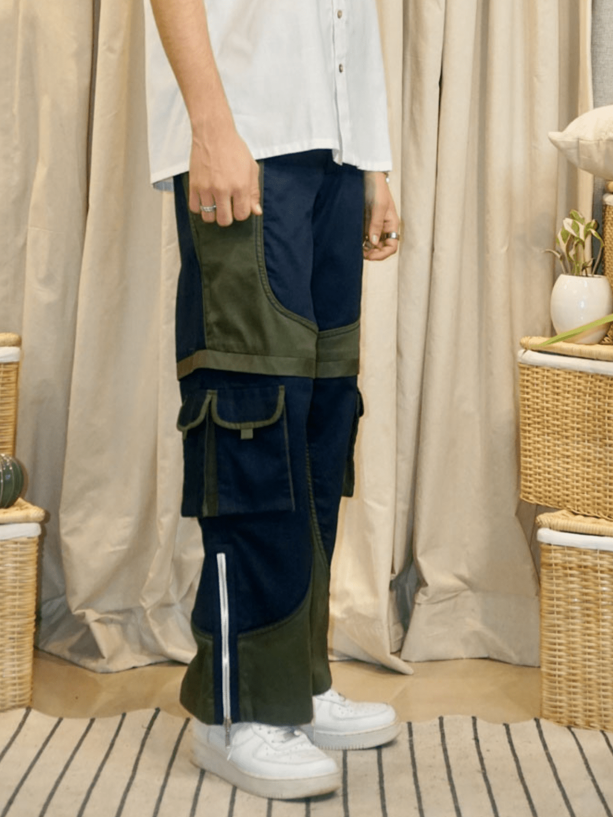 A dual tone cargo pants with symmetrical design on both sides and a side zipper on the hem of the pants. Relaxed Fit