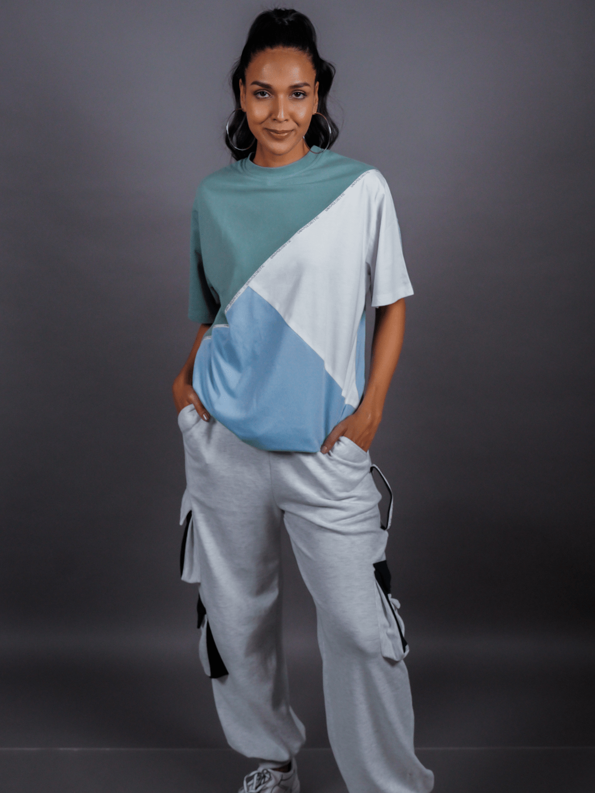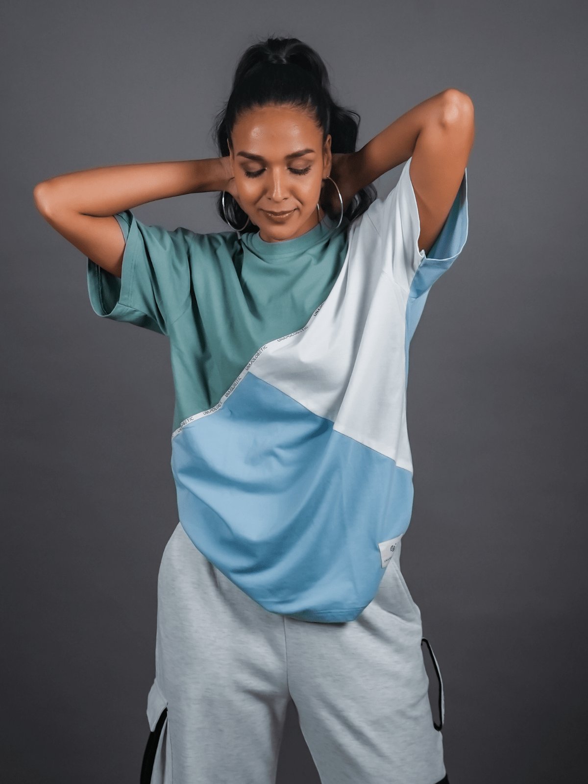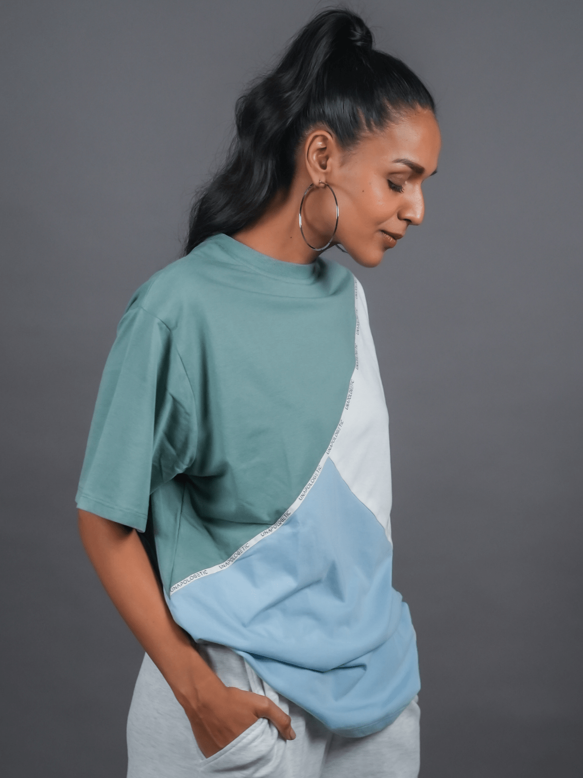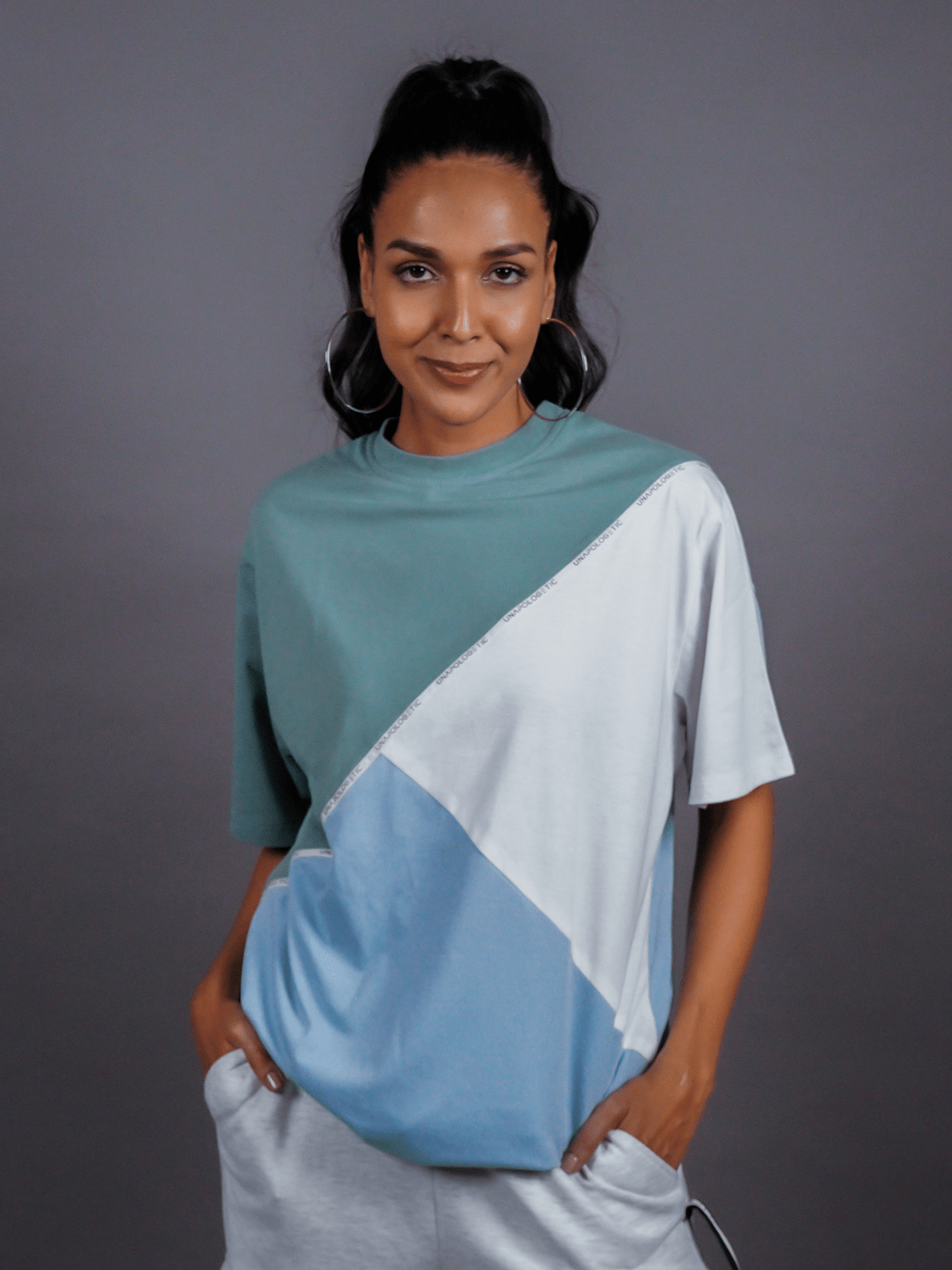 Design Detail: Three colours of the single jersey knit fabric stitched diagonally with each other representing inclusivity and oneness, Straight hemline