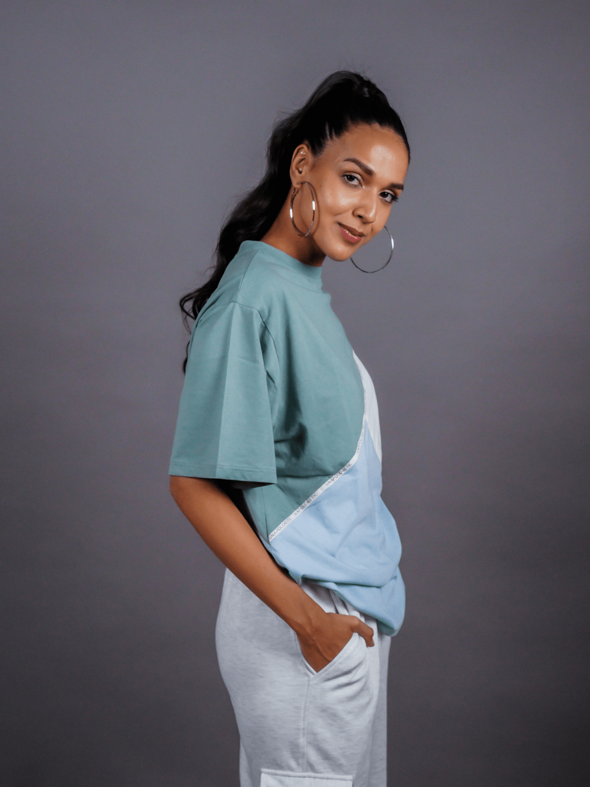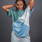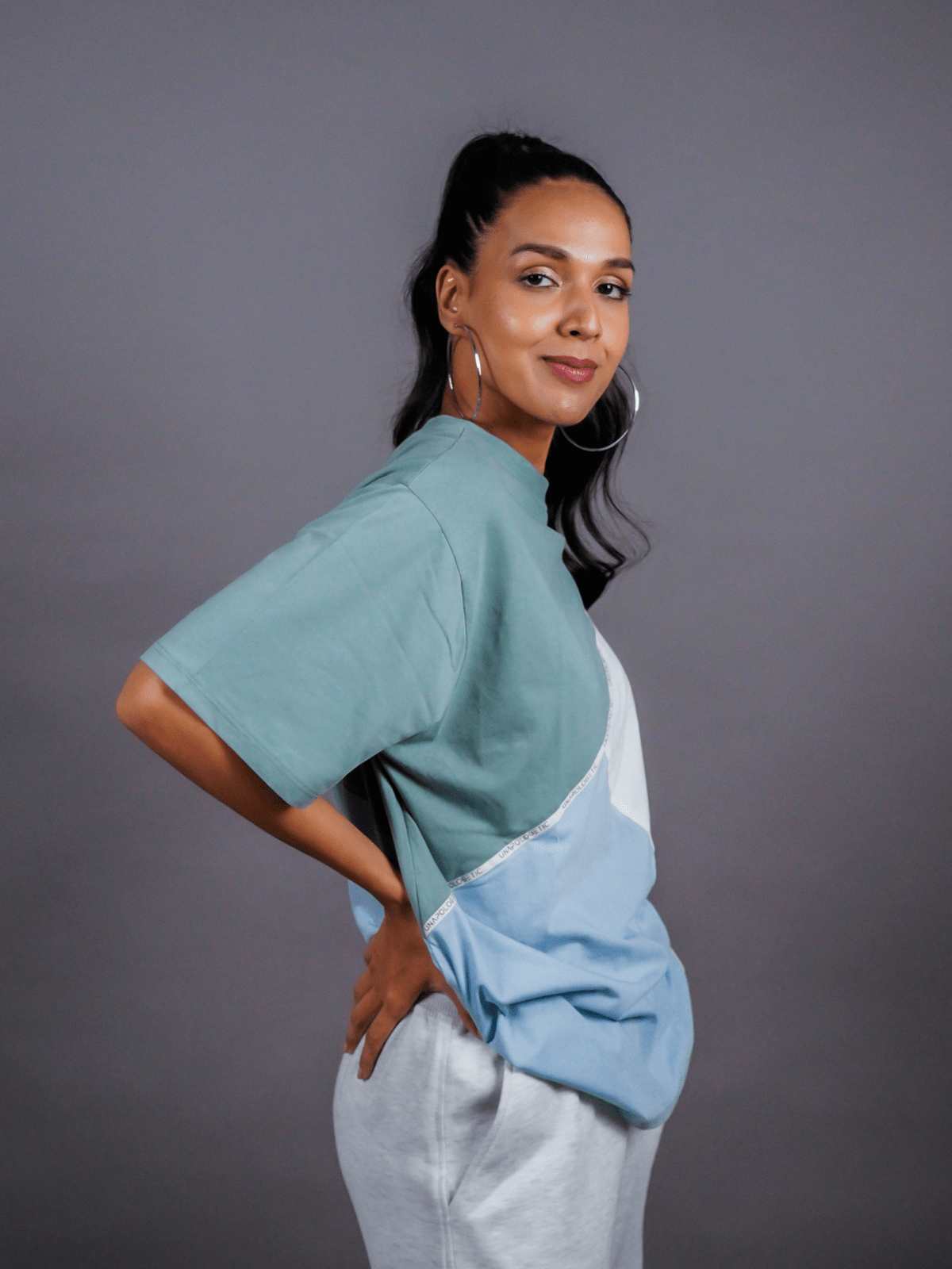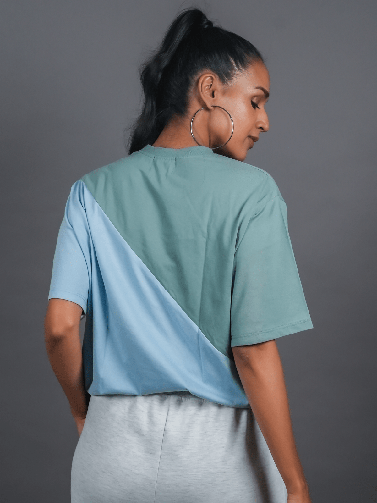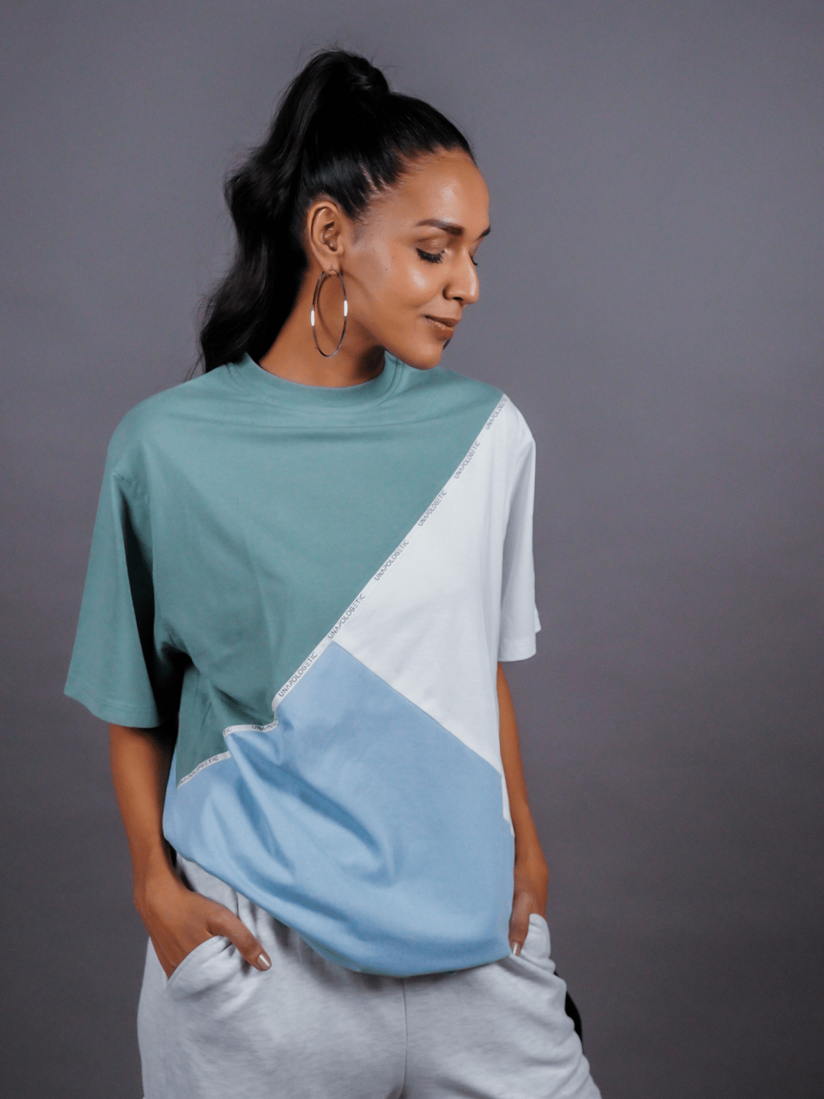 Design Detail: Three colours of the single jersey knit fabric stitched diagonally with each other representing inclusivity and oneness, Straight hemline