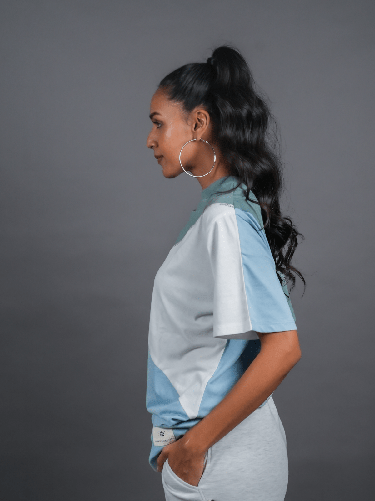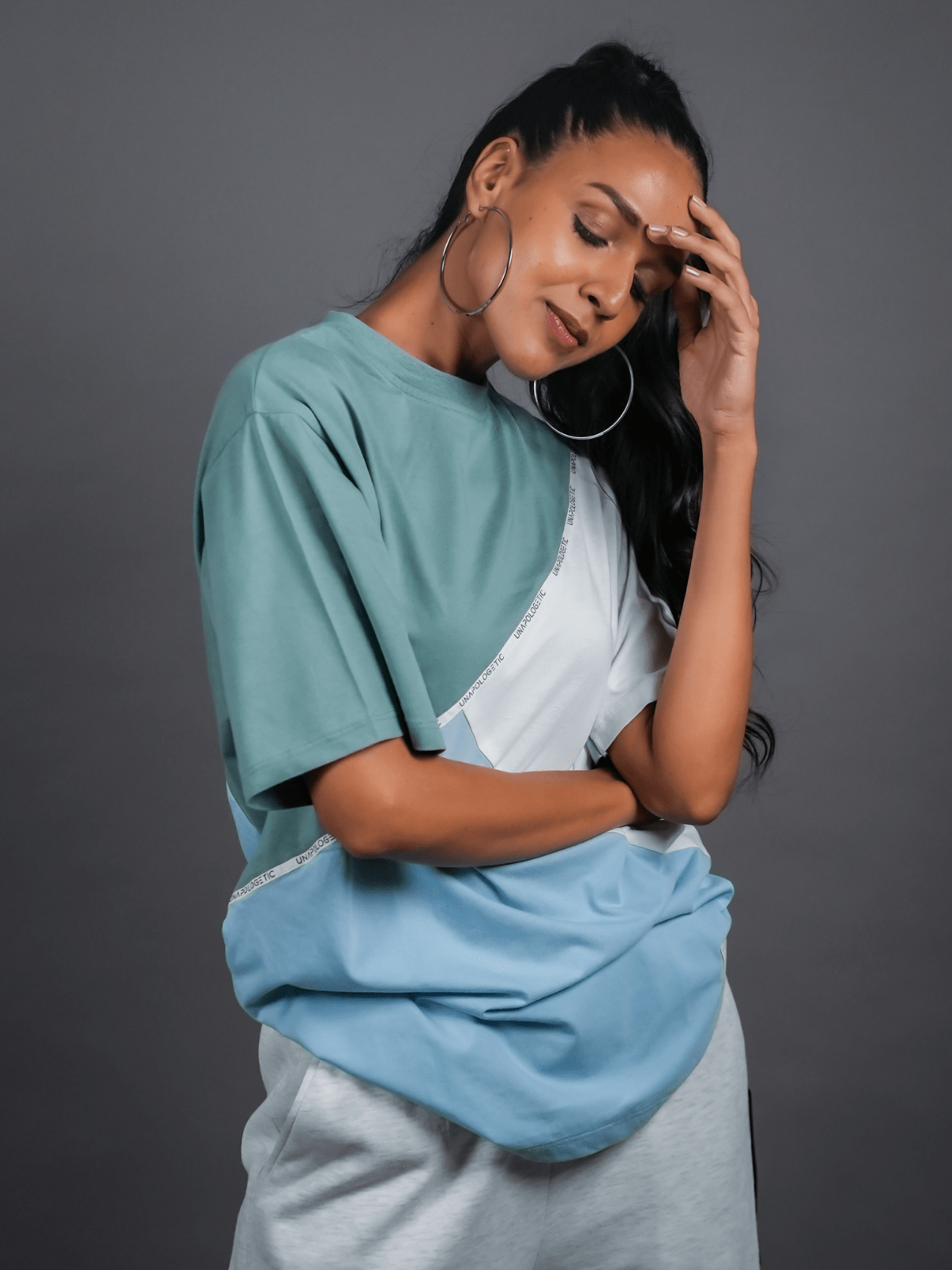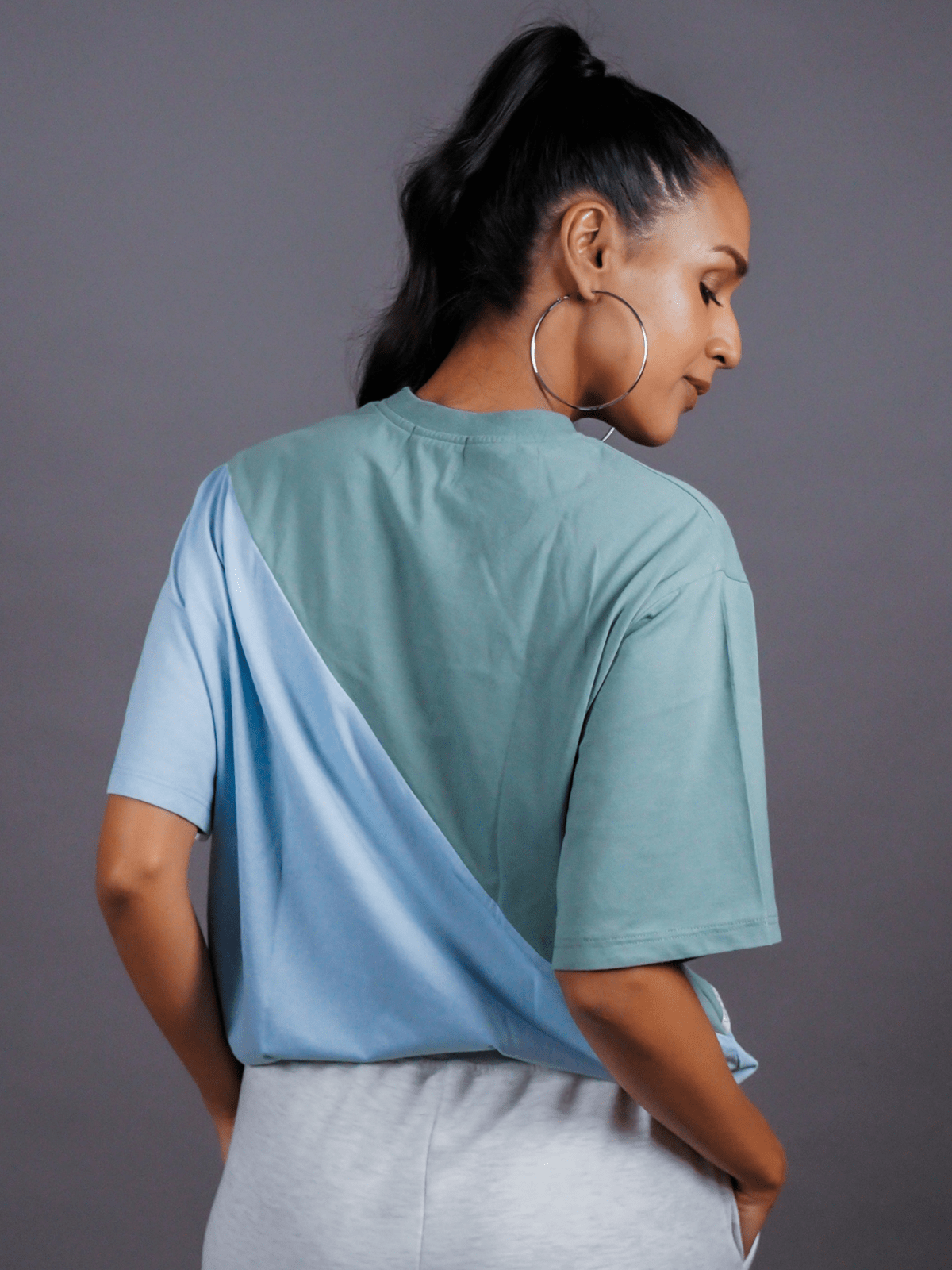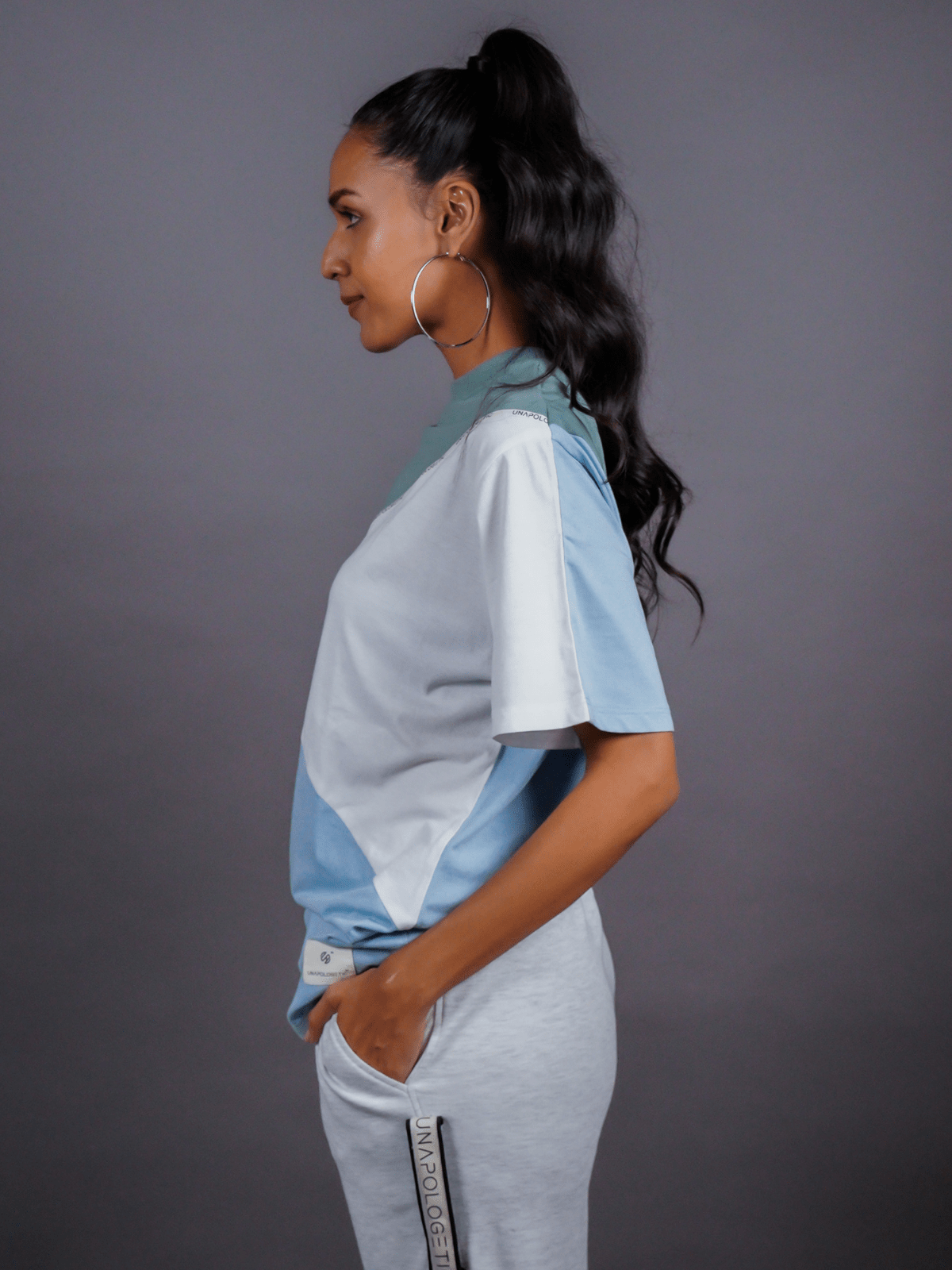 Design Detail: Three colours of the single jersey knit fabric stitched diagonally with each other representing inclusivity and oneness, Straight hemline