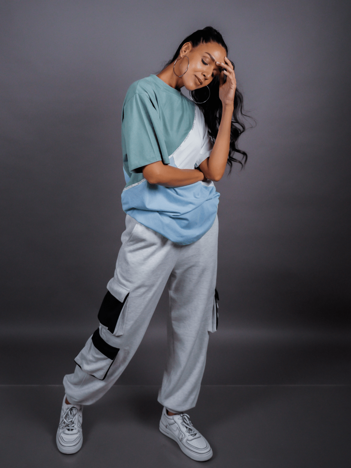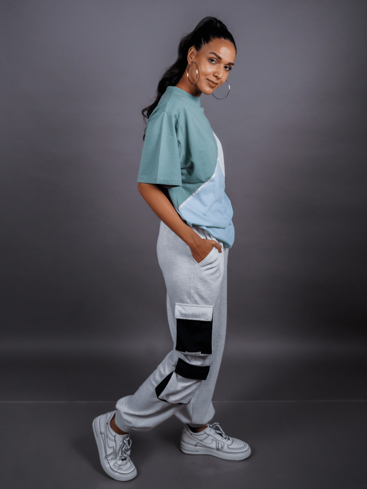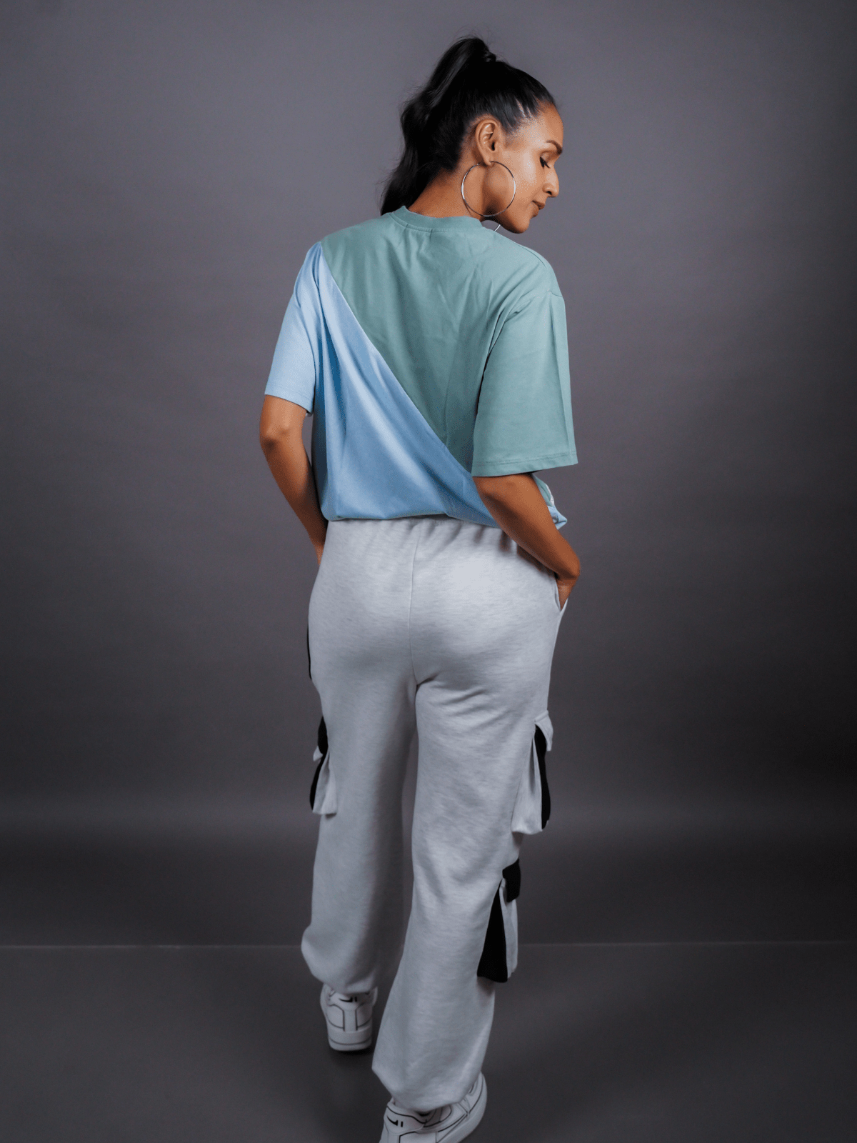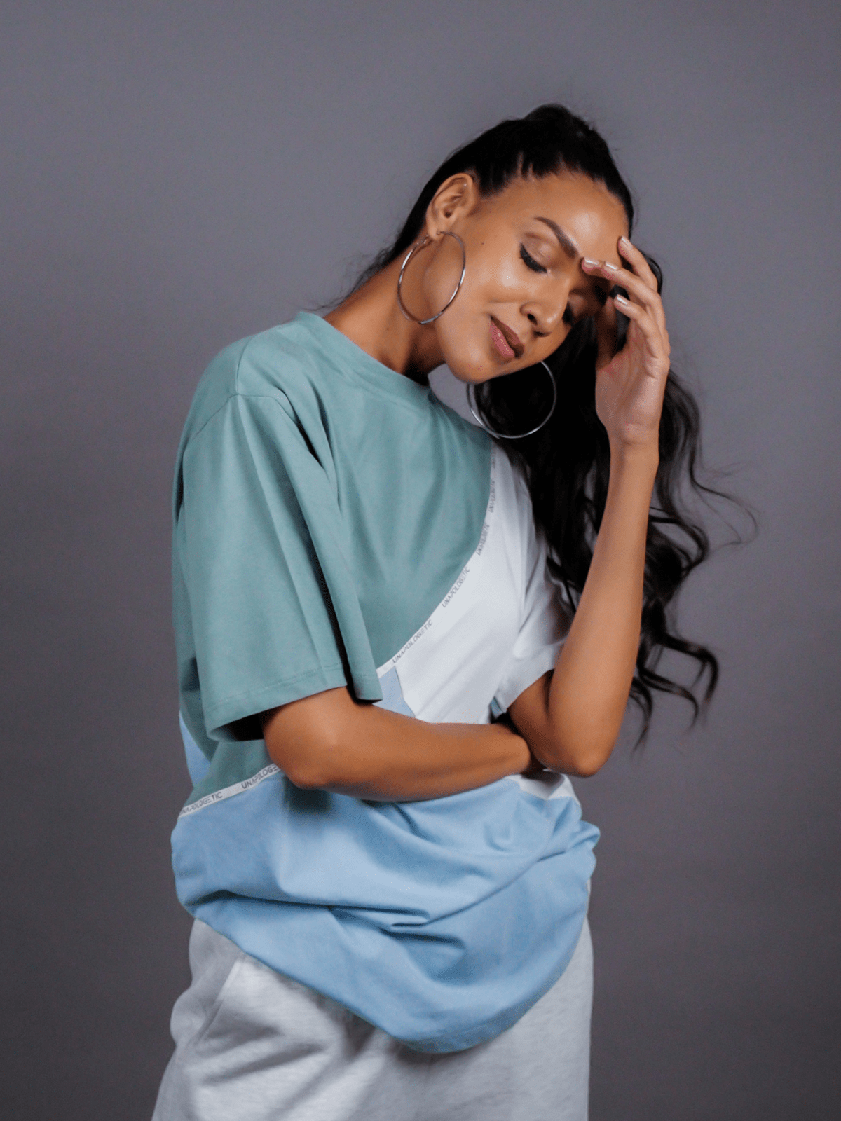 Design Detail: Three colours of the single jersey knit fabric stitched diagonally with each other representing inclusivity and oneness, Straight hemline